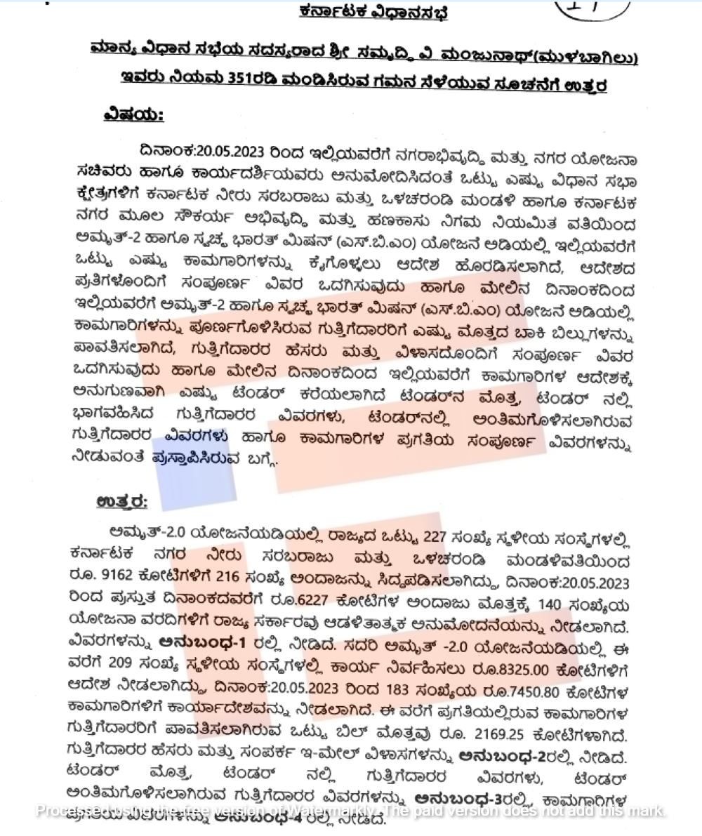ಅಮೃತ್ 2.0 ಯೋಜನೆಯಡಿಯಲ್ಲಿ ರಾಜ್ಯದ ಒಟ್ಟು 227 ಸಂಖ್ಯೆ ಸ್ಥಳೀಯ ಸಂಸ್ಥೆಗಳಲ್ಲಿ ಕರ್ನಾಟಕ ನಗರ ನೀರು ಸರಬರಾಜು ಮತ್ತು ಒಳಚರಂಡಿ ಮಂಡಳಿಯಿಂದ 9,162 ಕೋಟಿ ರುಗಳಿಗೆ 216 ಸಂಖ್ಯೆಯ ಅಂದಾಜನ್ನು ಸಿದ್ಧಪಡಿಸಲಾಗಿದೆ. 2023ರ ಮೇ 20ರರಿಂದ ಇದುವರೆಗೆ 6,227 ಕೋಟಿ ರು.ಗಳ ಅಂದಾಜು ಮೊತ್ತಕ್ಕೆ 140 ಸಂಖ್ಯೆಯ ಯೋಜನಾ ವರದಿಗಳಿಗೆ ರಾಜ್ಯ ಸರ್ಕಾರವು ಆಡಳಿತಾತ್ಮಕ ಅನುಮೋದನೆ ನೀಡಿತ್ತು.