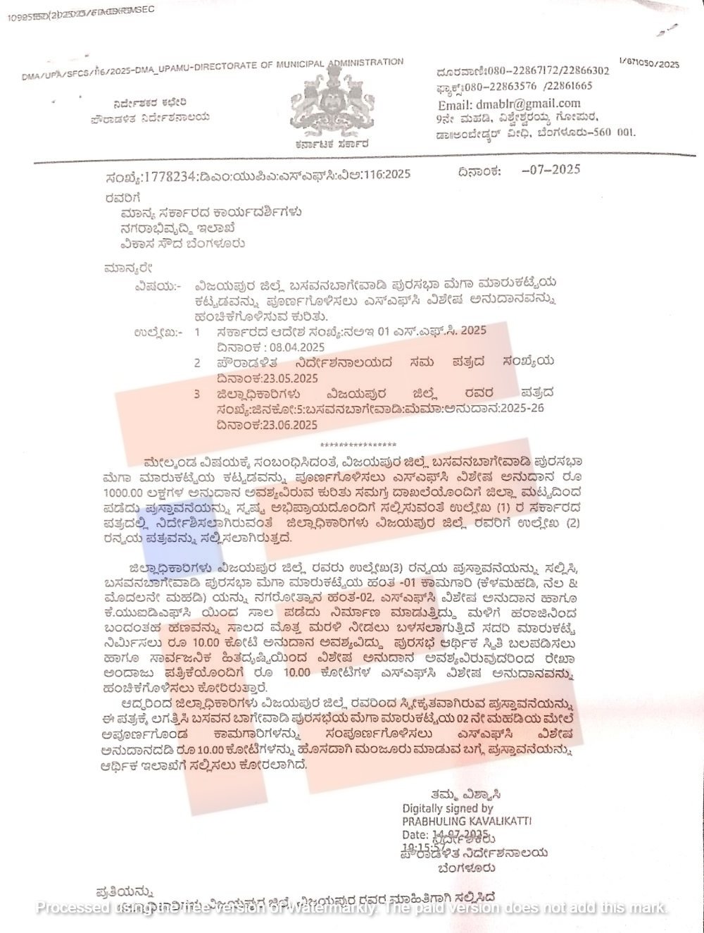 ಪೌರಾಡಳಿತ ನಿರ್ದೇಶನಾಲಯದ ಕೋರಿಕೆಯಂತೆ ನಗರಾಭಿವೃದ್ಧಿ ಇಲಾಖೆಯು 10 ಕೋಟಿ ರು ಮೊತ್ತದ ವಿಶೇಷ ಅನುದಾನ ಒದಗಿಸಲು ಆರ್ಥಿಕ ಇಲಾಖೆಯ ಕದ ತಟ್ಟಿತ್ತು. ಈ ಪ್ರಸ್ತಾವನೆಯನ್ನು ಪರಿಶೀಲಿಸಿದ್ದ ಆರ್ಥಿಕ ಇಲಾಖೆಯು ಪ್ರಸ್ತುತ ಪ್ರಸ್ತಾವನೆಯನ್ನು ಮುಂದೂಡಬೇಕು ಎಂದು ನಗರಾಭಿವೃದ್ಧಿ ಇಲಾಖೆಗೆ ತಿಳಿಸಿತ್ತು. ಈ ಸಂಬಂಧ 2025ರ ಆಗಸ್ಟ್ 18ರಂದು ಹಿಂಬರಹವನ್ನು ನೀಡಿತ್ತು.