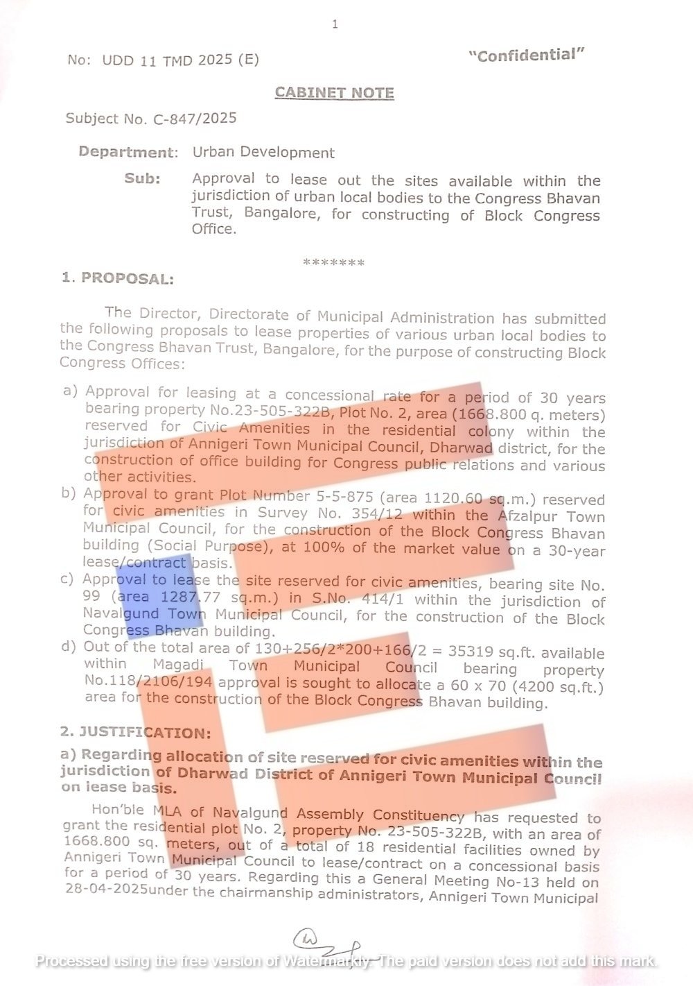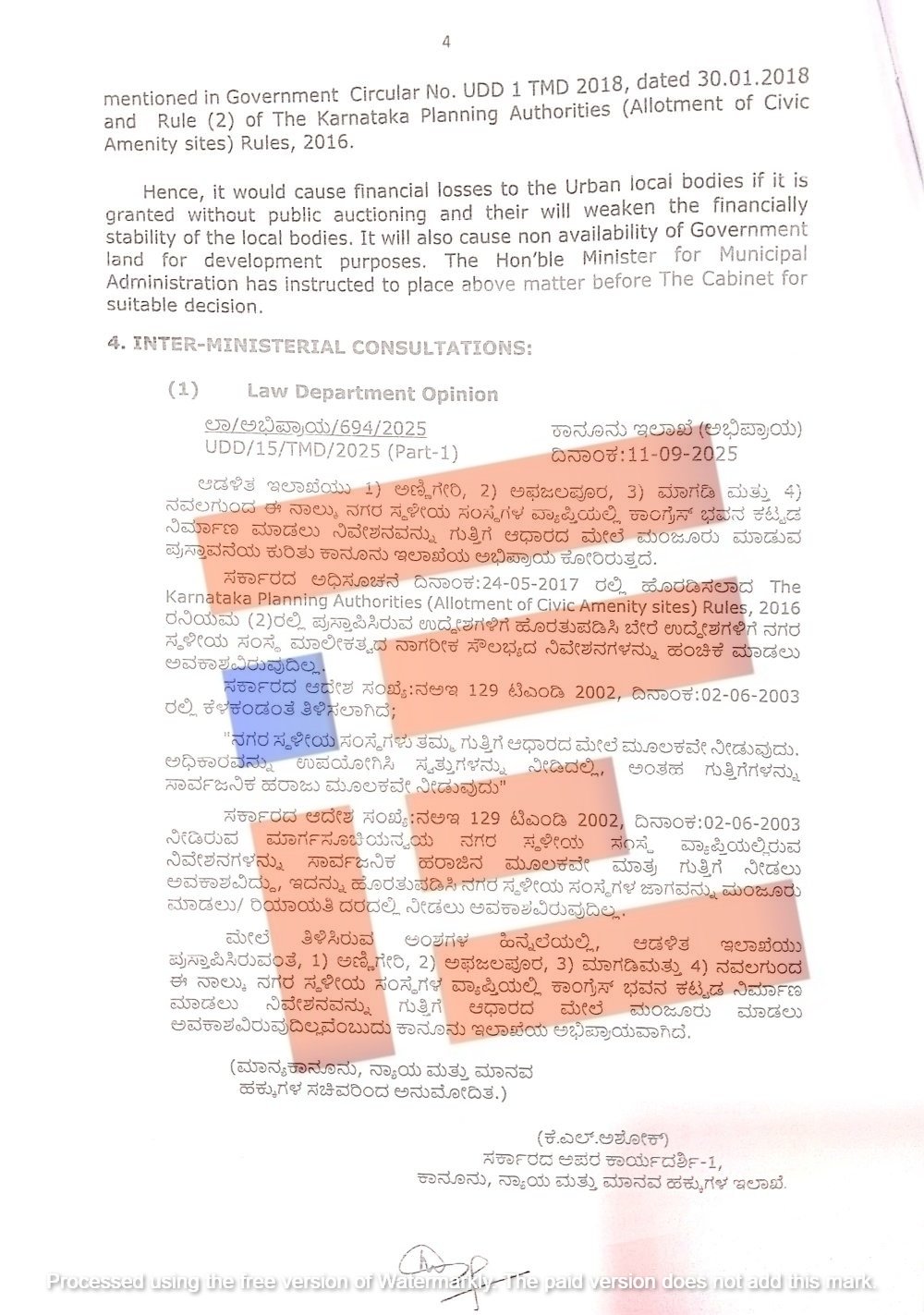 ಆದರೂ ಸಹ ಉಪ ಮುಖ್ಯಮಂತ್ರಿ ಡಿ ಕೆ ಶಿವಕುಮಾರ್ ಅವರ ಒತ್ತಡದ ಮೇರೆಗೆ ನಾಲ್ಕು ನಗರ ಸ್ಥಳೀಯ ಸಂಸ್ಥೆಗಳಿಗೆ ಕಾಂಗ್ರೆಸ್ ಭವನ ಟ್ರಸ್ಟ್ಗೆ ಸಚಿವ ಸಂಪುಟವೂ 8,277.17 ಚದರ ಅಡಿ ವಿಸ್ತಿರ್ಣದ ನಿವೇಶನಗಳನ್ನು ಮಂಜೂರು ಮಾಡಿದೆ.