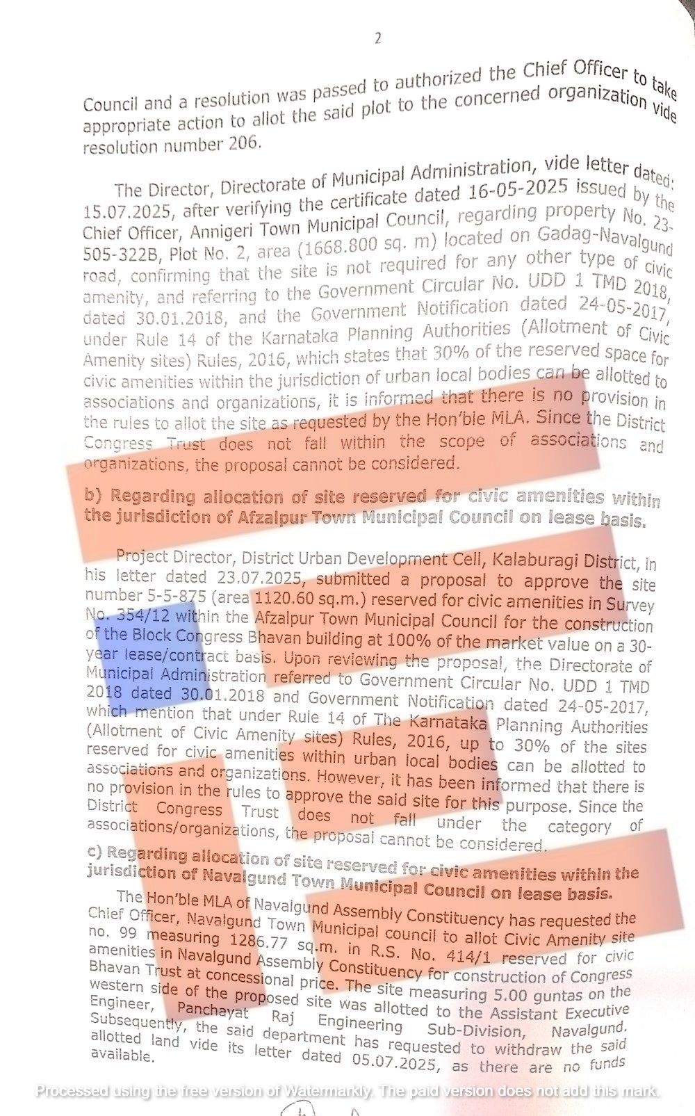 ಅಣ್ಣಿಗೇರಿ, ಅಫಜಲಪೂರ, ಮಾಗಡಿ ಮತ್ತು ನವಲಗುಂದದ ನಗರ ಸ್ಥಳೀಯ ಸಂಸ್ಥೆಗಳಲ್ಲಿನ ವ್ಯಾಪ್ತಿಯಲ್ಲಿ ಕಾಂಗ್ರೆಸ್ ಭವನ ಕಟ್ಟಡ ನಿರ್ಮಾಣ ಮಾಡಲು ನಿವೇಶನಕ್ಕಾಗಿ ಆಡಳಿತ ಇಲಾಖೆಯು ಪ್ರಸ್ತಾವಿಸಿದೆ. ಗುತ್ತಿಗೆ ಆಧಾರದ ಮೇಲೆ ಮಂಜೂರು ಮಾಡಲು ಪ್ರಸ್ತಾವನೆ ಸಲ್ಲಿಸಿದೆ. ನಗರ ಸ್ಥಳೀಯ ಸಂಸ್ಥೆಗಳ ಮಾಲೀಕತ್ವದ ನಾಗರಿಕ ಸೌಲಭ್ಯದ ನಿವೇಶನಗಳನ್ನು ಹಂಚಿಕೆ ಮಾಡಲು ಸರ್ಕಾರವು 2017ರ ಮೇ 24ರಂದೇ ನಿರ್ಬಂಧಿಸಿತ್ತು. ನಾಗರಿಕ ಸೌಲಭ್ಯಗಳ ಹೊರತುಪಡಿಸಿ ಬೇರೆ ಉದ್ದೇಶಗಳಿಗೆ ಸಿ ಎ ನಿವೇಶನಗಳನ್ನು ಹಂಚಿಕೆ ಮಾಡಲು ಅವಕಾಶವಿಲ್ಲ ಎಂದು ಸ್ಪಷ್ಟವಾಗಿ ಹೇಳಿದೆ.