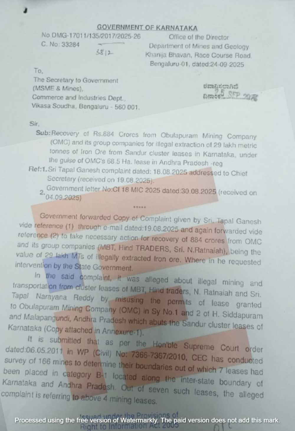 ಈ ಪತ್ರವನ್ನು ಪರಿಶೀಲಿಸಿ ಕ್ರಮ ಕೈಗೊಳ್ಳಲು ಗಣಿ ಮತ್ತು ಭೂ ವಿಜ್ಞಾನ ಇಲಾಖೆಯ ಸರ್ಕಾರದ ಪ್ರಧಾನ ಕಾರ್ಯದರ್ಶಿಗೆ ಸೂಚಿಸಿದ್ದರು. ಈ ಸೂಚನೆಯಂತೆ ಇಲಾಖೆಯ ನಿರ್ದೇಶಕರು ಸರ್ಕಾರಕ್ಕೆ 2025ರ ಸೆ. 29ರಂದು ಬರೆದಿರುವ ಪತ್ರದಲ್ಲಿ ಈ ಮಾಹಿತಿಯಿದೆ.