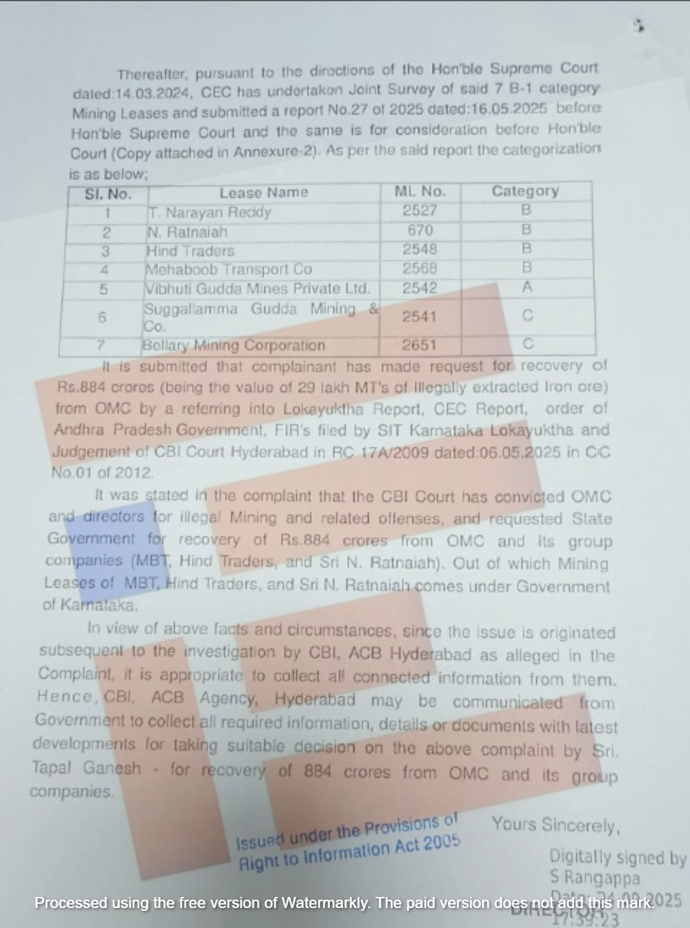 ಈ ಪ್ರಕರಣವನ್ನು ಸಿಬಿಐ ಮತ್ತು ಹೈದರಾಬಾದ್ನ ಭ್ರಷ್ಟಾಚಾರ ನಿಗ್ರಹ ದಳವು ತನಿಖೆ ಮಾಡಿರುವ ಕಾರಣ ವಸೂಲಾತಿಗೆ ಸಂಬಂಧಿಸಿದ ಮಾಹಿತಿಯನ್ನು ಈ ಎರಡೂ ಸಂಸ್ಥೆಗಳಿಂದ ಮಾಹಿತಿ ಪಡೆದ ನಂತರವಷ್ಟೇ ವಸೂಲಿ ಕ್ರಮಗಳನ್ನು ಕೈಗೊಳ್ಳಬಹುದು ಎಂದು ಗಣಿ ಮತ್ತು ಭೂ ವಿಜ್ಞಾನ ಇಲಾಖೆ ನಿರ್ದೇಶಕರು ಸರ್ಕಾರಕ್ಕೆ ಪತ್ರ ಬರೆದಿದ್ದಾರೆ.