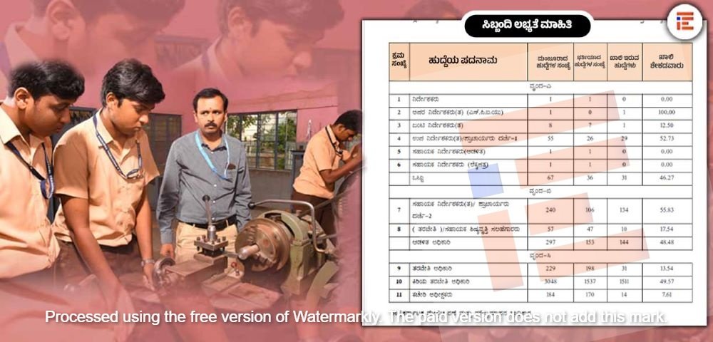 ‘ವೃಂದ-ಬಿ’ಯಲ್ಲಿ ಪ್ರಿನ್ಸಿಪಲ್ ಗ್ರೇಡ್-2/ವೈಸ್ ಪ್ರಿನ್ಸಿಪಲ್/ ಸಹಾಯಕ ನಿರ್ದೇಶಕ (ತರಬೇತಿ)/ಸಹಾಯಕ ಅಪ್ರೆಂಟಿಸ್ ಶಿಪ್ ಸಲಹೆಗಾರರ ಹುದ್ದೆಗಳಲ್ಲಿ ಶೇಕಡಾ 48.48ರಷ್ಟು ಖಾಲಿ ಇವೆ. ‘ವೃಂದ-ಸಿ’ ದಲ್ಲಿ ಶೇಕಡಾ 45.83ರಷ್ಟು ಹಾಗೂ ಟೈಪಿಸ್ಟ್ ಹುದ್ದೆಗಳಲ್ಲಿ ಶೇಕಡಾ 90.30ರಷ್ಟು ಖಾಲಿ ಉಳಿದಿವೆ. ‘ವೃಂದ-ಡಿ’ ದಲ್ಲಿ ಸಾಕಷ್ಟು ಹುದ್ದೆಗಳು ಖಾಲಿ ಇರುವುದರಿಂದ ಕಾರ್ಯಾಗಾರದ ಅಟೆಂಡರ್, ಜಮೇದಾರ್/ ಸಹಾಯಕ ಸಿಬ್ಬಂದಿಯಲ್ಲಿ ತೀವ್ರ ಕೊರತೆ ಇದೆ ಎಂಬುದು ಅಂಕಿಅಂಶಗಳಿಂದ ತಿಳಿಯುತ್ತದೆ.