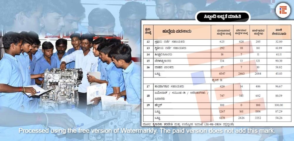 ರಾಜ್ಯದ ಐಟಿಐಗಳಲ್ಲಿ 2024ರ ಜನವರಿ 31ರ ಪ್ರಕಾರ ಖಾಲಿ ಇರುವ ಮಂಜೂರಾತಿ ಹುದ್ದೆಗಳ ಪ್ರಮಾಣವು ಶೇಕಡಾ 46.26ರಷ್ಟಿದೆ. ‘ವೃಂದ-ಎ’ದಲ್ಲಿ ಶೇಕಡಾ 52.73ರಷ್ಟು ಉಪ ನಿರ್ದೇಶಕರು (ತರಬೇತಿ) ಪ್ರಿನ್ಸಿಪಲ್ ಗ್ರೇಡ್-1 ಸ್ಥಾನದ ಹುದ್ದೆಗಳು ಖಾಲಿ ಇವೆ.