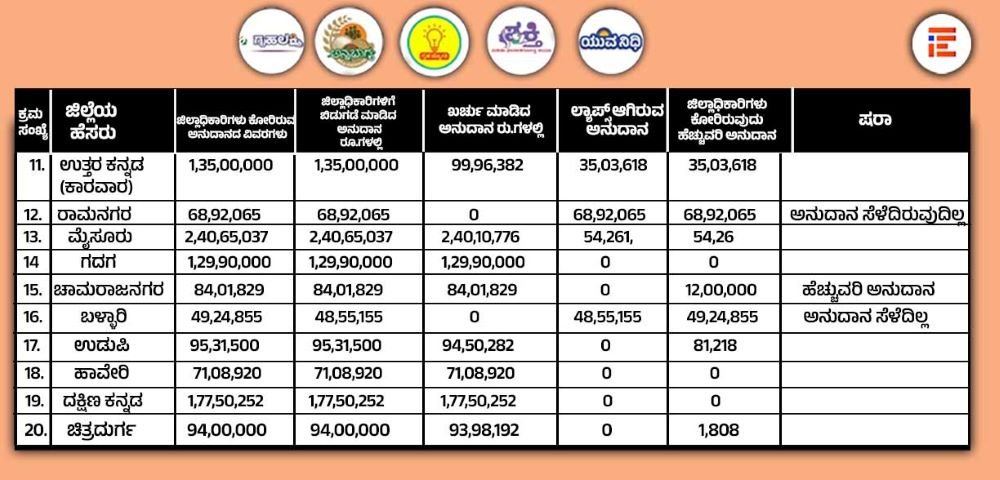 ಬಳ್ಳಾರಿ ಜಿಲ್ಲಾಧಿಕಾರಿಯು 49,24,855 ರು ಅನುದಾನ ಕೋರಿದ್ದರು. ಈ ಪೈಕಿ 48,55,155 ರು ಬಿಡುಗಡೆ ಮಾಡಲಾಗಿತ್ತು. ಆದರೆ ಈ ಅನುದಾನವನ್ನು ಡ್ರಾ ಮಾಡಿರಲಿಲ್ಲ. ಹೀಗಾಗಿ ಲ್ಯಾಪ್ಸ್ ಆಗಿತ್ತು. ಇದೇ ಅನುದಾವನ್ನು ಹೆಚ್ಚುವರಿಯಾಗಿ ಮಂಜೂರು ಮಾಡಲು ಕೋರಿದ್ದರು. ಉಡುಪಿ ಜಿಲ್ಲಾಧಿಕಾರಿಯು 95,31,500 ರು ಅನುದಾನ ಕೋರಿದ್ದರು. 95,31,500 ರು ಬಿಡುಗಡೆಯಾಗಿತ್ತು. 94,50,282 ರು ಖರ್ಚಾಗಿತ್ತು. ಆದರೂ 81,218 ರು.ಗಳನ್ನು ಹೆಚ್ಚುವರಿಯಾಗಿ ಕೋರಿದ್ದರು. ಹಾವೇರಿ ಜಿಲ್ಲಾಧಿಕಾರಿಯು 71,08,920 ರು ಕೋರಿದ್ದರು. 71,08,920 ರು ಬಿಡುಗಡೆಯಾಗಿತ್ತು. ಬಿಡುಗಡೆಯಾಗಿದ್ದ ಈ ಅನುದಾನವನ್ನು ಸಂಪೂರ್ಣವಾಗಿ ಖರ್ಚು ಮಾಡಿದ್ದರು.
