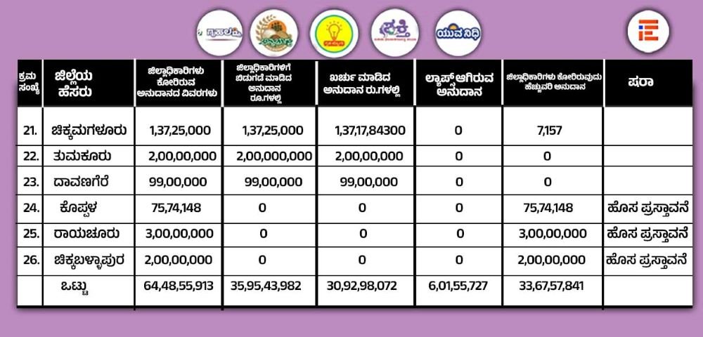 ಗ್ಯಾರಂಟಿ ಸಮಾವೇಶಗಳಿಗಾಗಿ ಬಿಡುಗಡೆ ಮಾಡಿದ್ದ ಅನುದಾನವನ್ನು 23 ಜಿಲ್ಲೆಗಳಲ್ಲಿ ಖರ್ಚು ಮಾಡಲಾಗಿತ್ತು. ಕೆಲವು ಜಿಲ್ಲೆಗಳಲ್ಲಿ ಅನುದಾನವನ್ನು ಬಳಕೆ ಮಾಡದ ಕಾರಣ ಲ್ಯಾಪ್ಸ್ ಆಗಿತ್ತು. ಇದರ ಮೊತ್ತ 6 ಕೋಟಿ 1 ಲಕ್ಷ 55 ಸಾವಿರ 727 ರು ಗಳಷ್ಟಿತ್ತು. ಅಲ್ಲದೇ 33 ಕೋಟಿ 67 ಲಕ್ಷ 57 ಸಾವಿರ 841 ರು ಅನುದಾನ ಕೊರತೆ ಇದೆ ಎಂದು ಜಿಲ್ಲಾಧಿಕಾರಿಗಳು ಹೆಚ್ಚುವರಿ ಮನವಿ ಮತ್ತು ಹೆಚ್ಚುವರಿ ಅನುದಾನ ಬಿಡುಗಡೆ ಮಾಡಬೇಕು ಎಂದು ಕೋರಿದ್ದರು.