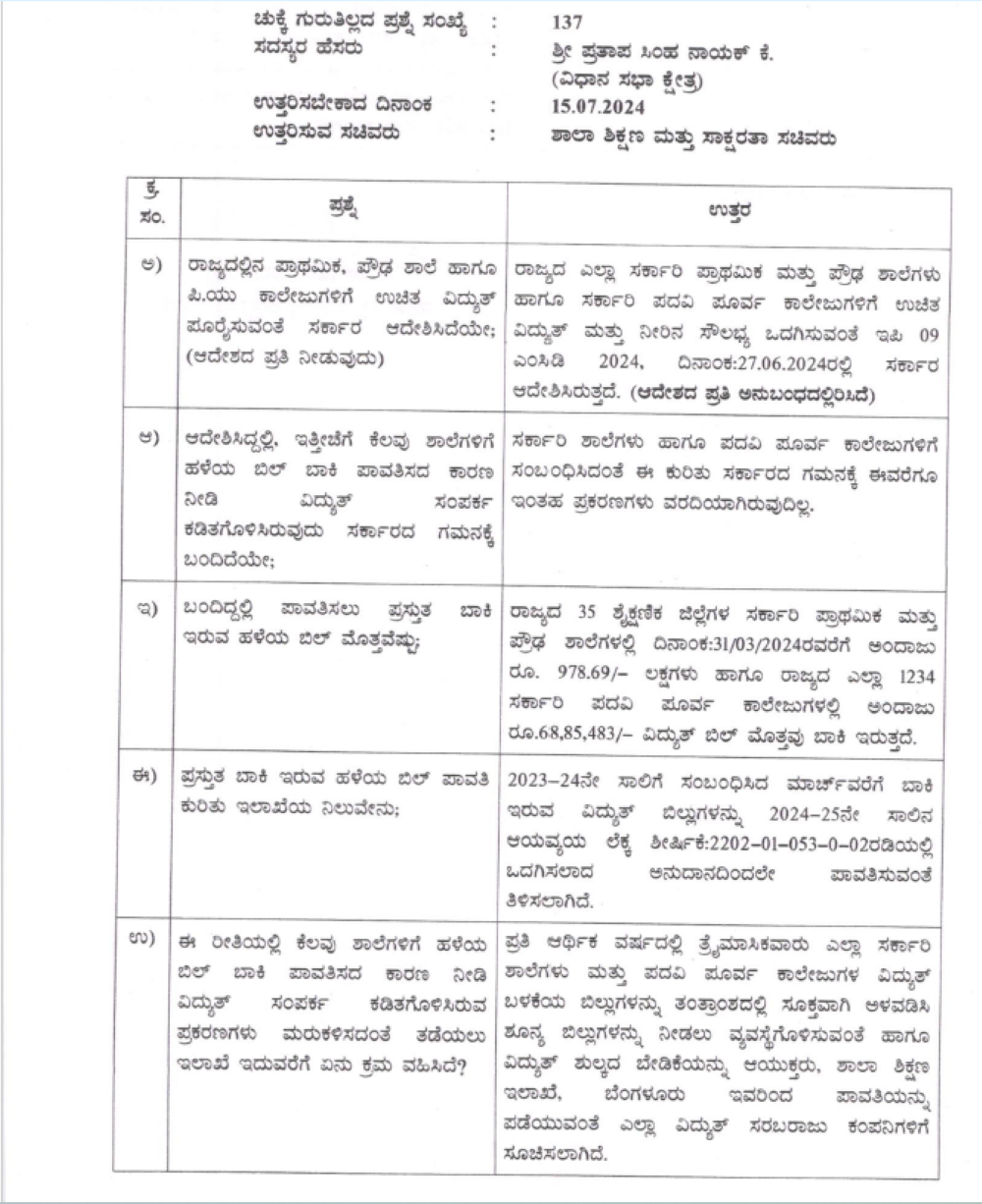 ರಾಜ್ಯದ 35 ಶೈಕ್ಷಣಿಕ ಜಿಲ್ಲೆಗಳ ಸರ್ಕಾರಿ ಪ್ರಾಥಮಿಕ ಮತ್ತು ಪ್ರೌಢಶಾಲೆಗಳಲ್ಲಿ 2024ರ ಮಾರ್ಚ್‌ 31ರವರೆಗೆ ಅಂದಾಜು 9.78 ಕೋಟಿ ರು ಮತ್ತು ರಾಜ್ಯದ ಎಲ್ಲಾ 1,234 ಸರ್ಕಾರಿ ಪದವಿಪೂರ್ವ ಕಾಲೇಜುಗಳಲ್ಲಿ ಅಂದಾಜು 68,85, 483 ರು. ವಿದ್ಯುತ್‌ ಬಿಲ್‌ ಮೊತ್ತವು ಬಾಕಿ ಇತ್ತು. ಈ ಬಗ್ಗೆ ಖುದ್ದು ಸಚಿವ ಮಧು ಬಂಗಾರಪ್ಪ ಅವರು    2024ರ ಜುಲೈ 15ರಂದೇ ವಿಧಾನಪರಿಷತ್‌ಗೆ ಲಿಖಿತ ಉತ್ತರ ಒದಗಿಸಿದ್ದರು.