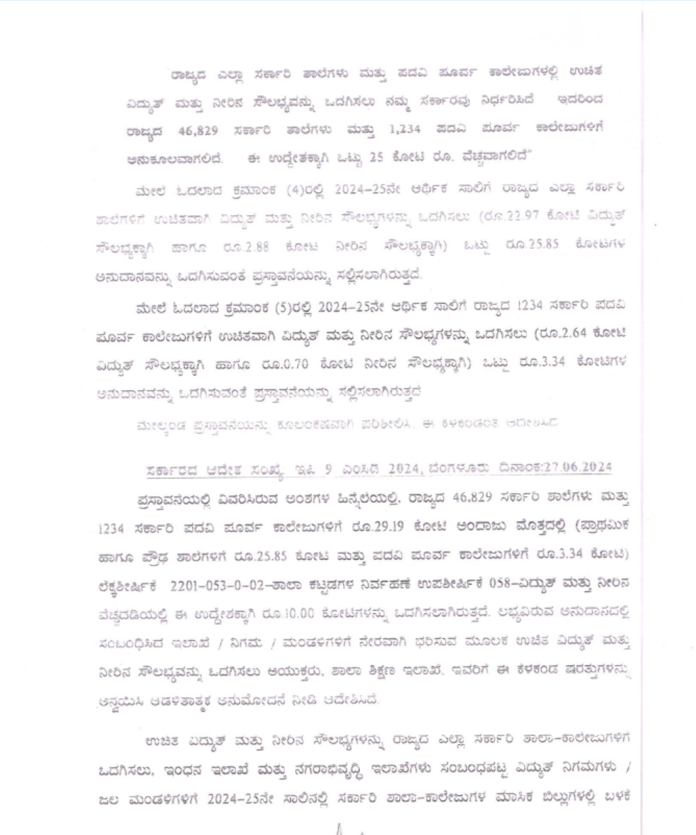 ರಾಜ್ಯದ 46,829 ಸರ್ಕಾರಿ ಶಾಲೆಗಳು ಮತ್ತು 1,234 ಸರ್ಕಾರಿ ಪದವಿಪೂರ್ವ ಕಾಲೇಜುಗಳಿಗೆ 29.19 ಕೋಟಿ ರು.ಗಳ ಅಂದಾಜು ಮೊತ್ತದಲ್ಲಿ (ಪ್ರಾಥಮಿಕ ಹಾಗೂ ಪ್ರೌಢಶಾಲೆಗಳಿಗೆ 25.85 ಕೋಟಿ ರು., ಪದವಿಪೂರ್ವ ಕಾಲೇಜುಗಳಿಗೆ 3.34 ಕೋಟಿ ರು) ವಿದ್ಯುತ್‌ ಮತ್ತು ನೀರಿನ ಬಿಲ್‌ ಪಾವತಿಸಲು ಉದ್ದೇಶಿಸಿತ್ತು. ಶಾಲಾ ಕಟ್ಟಡಗಳ ನಿರ್ವಹಣೆ ಉಪ ಶೀರ್ಷಿಕೆಯಡಿಯಲ್ಲಿ ಲಭ್ಯವಿದ್ದ ಅನುದಾನದ ಪೈಕಿ 10 ಕೋಟಿ ರು ಗಳನ್ನು ಒದಗಿಸಿತ್ತು. ಈ ಹಣವನ್ನು ನೇರವಾಗಿ ವಿದ್ಯುತ್ ಸರಬರಾಜು ಕಂಪನಿಗಳಿಗೆ ಪಾವತಿಸಲು 2024ರ ಜೂನ್‌ 27ರಂದೇ  ಆದೇಶಿಸಿತ್ತು.