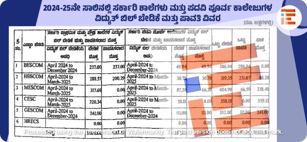 ಬೆಸ್ಕಾಂಗೆ 2024ರ ಏಪ್ರಿಲ್‌ನಿಂದ ಡಿಸೆಂಬರ್‍‌ 2024ರವರೆಗೆ ಸರ್ಕಾರಿ ಪ್ರಾಥಮಿಕ ಮತ್ತು ಪ್ರೌಢಶಾಲೆಗಳ ವಿದ್ಯುತ್‌ ಬಿಲ್‌  ಒಟ್ಟಾರೆ 2.37 ಕೋಟಿ ರು ಬೇಡಿಕೆ ಇತ್ತು. ಈ ಅವಧಿಯ ಬೇಡಿಕೆ ಪ್ರಕಾರ 2.37 ಕೋಟಿ ರುಗಳನ್ನು ಶಾಲಾ ಶಿಕ್ಷಣ ಮತ್ತು ಸಾಕ್ಷರತೆ ಇಲಾಖೆಯುಕ ಪಾವತಿಸಿತ್ತು. ಹೆಸ್ಕಾಂ ಗೆ 2024ರ ಏಪ್ರಿಲ್‌ನಿಂದ 2025ರ ಮಾರ್ಚ್‌ ಅವಧಿಯವರೆಗೆ   2.88 ಕೋಟಿ ರು ಬೇಡಿಕೆ ಇತ್ತು. ಈ ಪೈಕಿ 2.00 ಕೋಟಿ ರು ಪಾವತಿಸಿತ್ತು. ಇನ್ನುಳಿದ 88 ಲಕ್ಷ ರು ಬಾಕಿ ಇರಿಸಿಕೊಂಡಿತ್ತು.