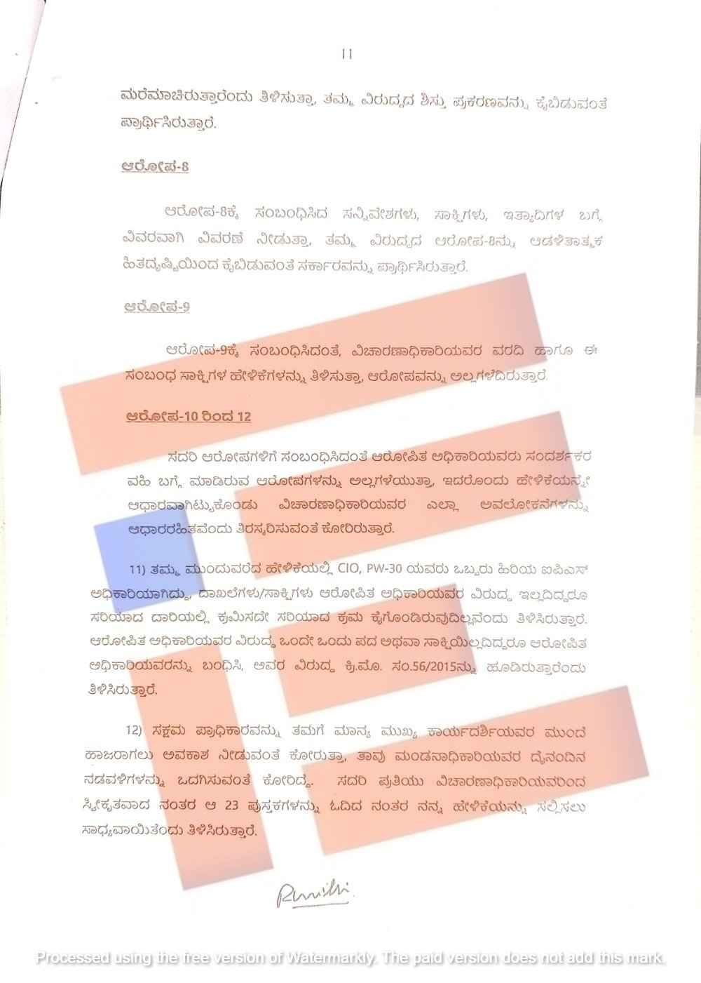 ಆರೋಪ-8ಕ್ಕೆ ಸಂಬಂಧಿಸಿದ ಸನ್ನಿವೇಶಗಳು, ಸಾಕ್ಷಿಗಳು, ಇತ್ಯಾದಿಗಳ ಬಗ್ಗೆ ವಿವರವಾಗಿ ವಿವರಣೆ ನೀಡಿದ್ಸದರು. ತಮ್ಮ ವಿರುದ್ಧದ ಆರೋಪ-8ನ್ನು ಆಡಳಿತಾತ್ಮಕ ಹಿತದೃಷ್ಟಿಯಿಂದ ಕೈಬಿಡುವಂತೆ ಸರ್ಕಾರವನ್ನು ಕೋರಿದ್ದರು. ಆರೋಪ-9ಕ್ಕೆ ಸಂಬಂಧಿಸಿದಂತೆ, ವಿಚಾರಣಾಧಿಕಾರಿಯವರ ವರದಿ ಹಾಗೂ ಈ ಸಂಬಂಧ ಸಾಕ್ಷಿಗಳ ಹೇಳಿಕೆಗಳನ್ನು ಉಲ್ಲೇಖಿಸಿ ಆರೋಪವನ್ನು ಅಲ್ಲಗಳೆದಿರುವುದು ತಿಳಿದು ಬಂದಿದೆ.