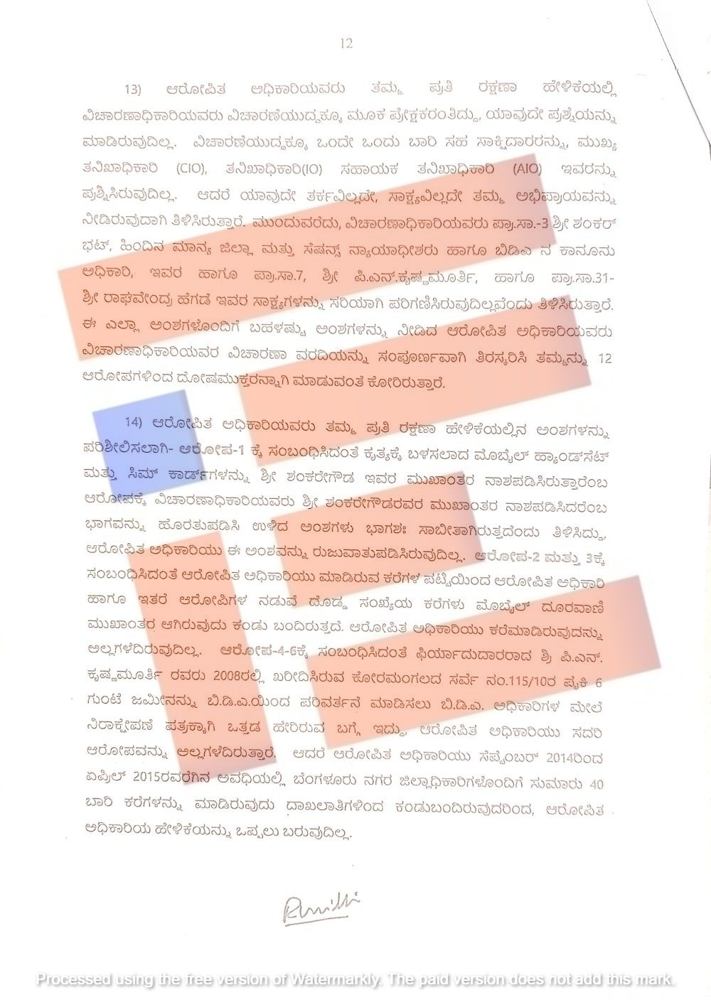 ಈ ಎಲ್ಲಾ ಅಂಶಗಳೊಂದಿಗೆ ಬಹಳಷ್ಟು ಅಂಶಗಳನ್ನು ಆರೋಪಿತ ಅಧಿಕಾರಿ ನೀಡಿದ್ದರು. ಅಲ್ಲದೇ ವಿಚಾರಣಾಧಿಕಾರಿಯವರ ವಿಚಾರಣಾ ವರದಿಯನ್ನು ಸಂಪೂರ್ಣವಾಗಿ ತಿರಸ್ಕರಿಸಬೇಕು. ತಮ್ಮನ್ನು 12 ಆರೋಪಗಳಿಂದ ದೋಷಮುಕ್ತರನ್ನಾಗಿ ಮಾಡಬೇಕು ಎಂದು ಕೋರಿದ್ದರು ಎಂದು ಆದೇಶದಲ್ಲಿ ವಿವರಿಸಿರುವುದು ತಿಳಿದು ಬಂದಿದೆ.