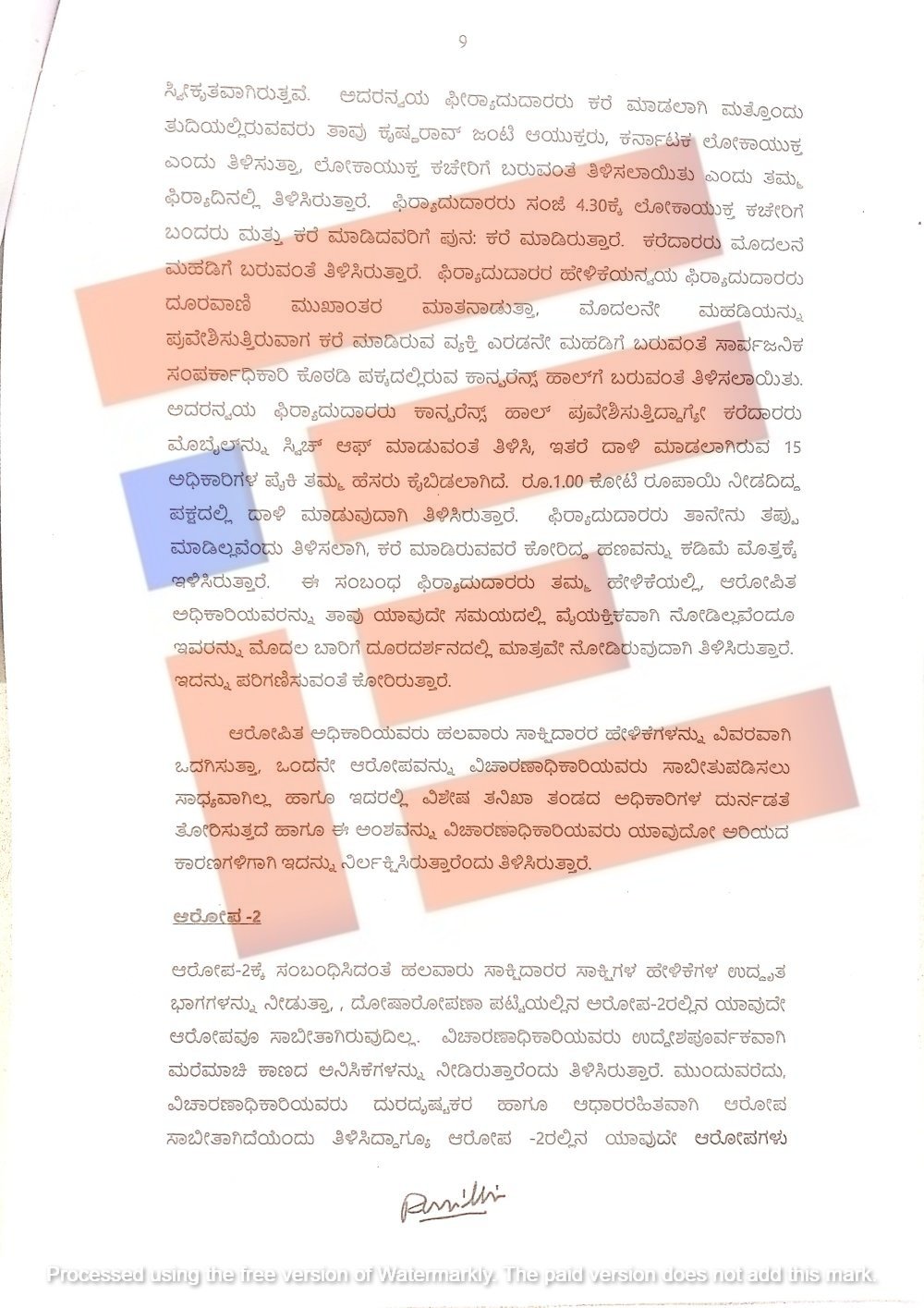 9ನೇ ಆರೋಪಕ್ಕೆ ಸಂಬಂಧಿಸಿದಂತೆ ಸಮಾಜ ಕಲ್ಯಾಣ ಇಲಾಖೆ ಪ್ರಧಾನ ಕಾರ್ಯದರ್ಶಿ ಗಂಗಾರಾಂ ಬಡೇರಿಯಾ ಅವರನ್ನು ಕರ್ನಾಟಕ ಲೋಕಾಯುಕ್ತರ ನಿವಾಸಕ್ಕೆ ಕರೆಯಿಸಿ, ಬೆದರಿಕೆ ಹಾಕಿ ಹಣಕ್ಕಾಗಿ ಬೇಡಿಕೆ ಇಟ್ಟಿದ್ದರು. ಈ ಬಗ್ಗೆ ಆರೋಪಿತ ಅಧಿಕಾರಿಯವರು ತನಿಖಾಧಿಕಾರಿಯವರಿಗೆ ತಾವು ಗಂಗಾರಾಂ ಬಡೇರಿಯಾರವರನ್ನು ಲೋಕಾಯುಕ್ತರ ನಿವಾಸಕ್ಕೆ ಕರೆಸಿರುವ ಬಗ್ಗೆ, ಸಾಕ್ಷ್ಯ ದೊರಕಿರುವುದಿಲ್ಲವೆಂದು ಹೇಳಿರುತ್ತಾರೆ.