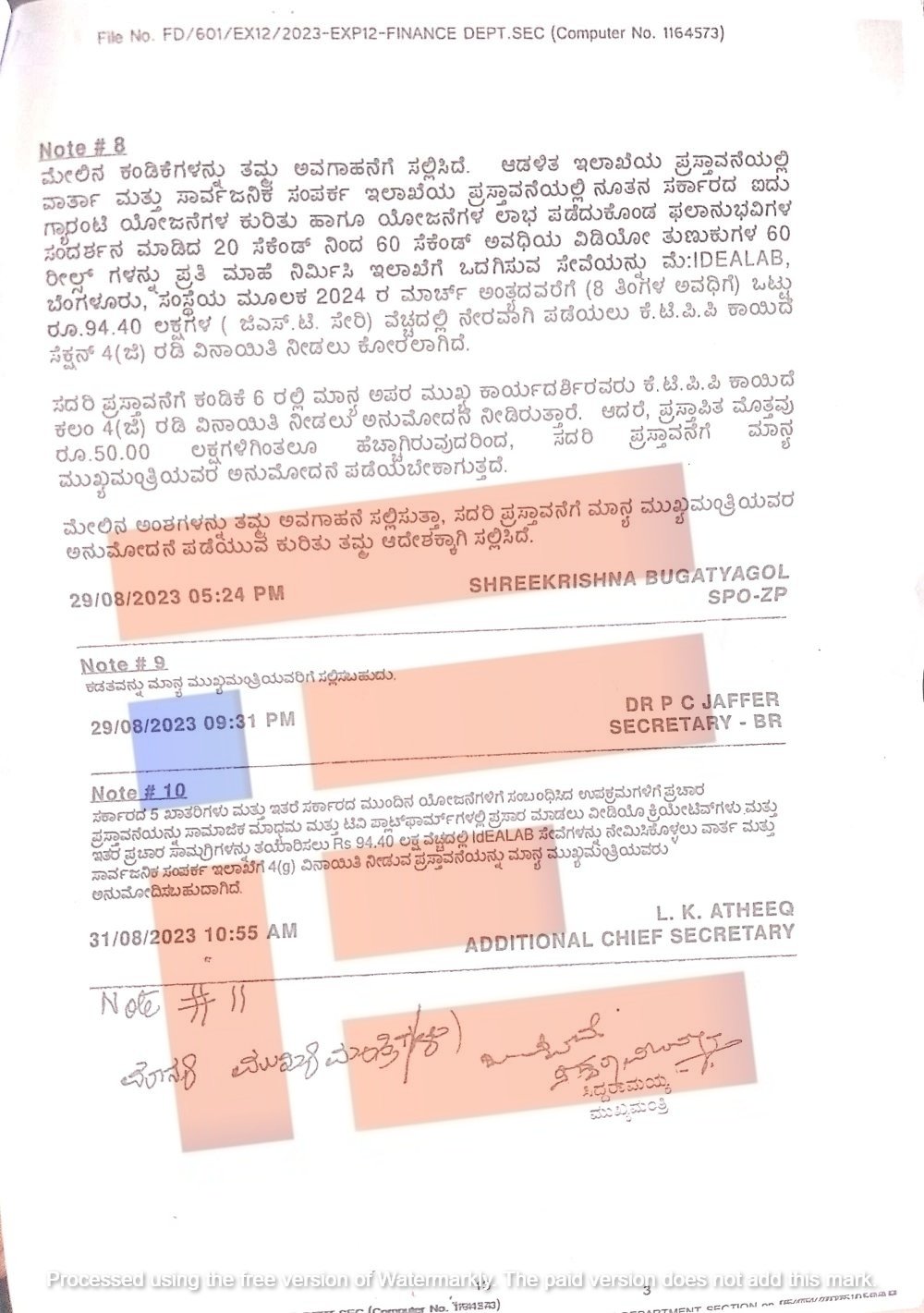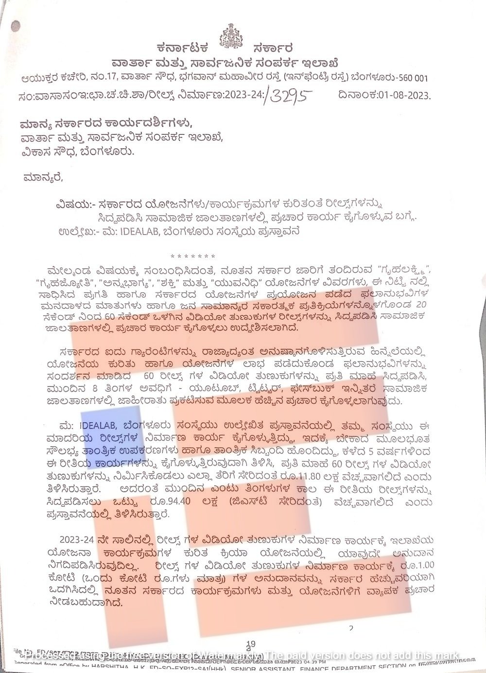 ಈ ಕಡತವನ್ನು ಮುಖ್ಯಮಂತ್ರಿ ಸಿದ್ದರಾಮಯ್ಯ ಅವರಿಗೆ ಸಲ್ಲಿಸಲಾಗಿತ್ತು. ಈ ಕಡತದಲ್ಲಿ -ಸರ್ಕಾರದ 5 ಖಾತರಿಗಳು ಮತ್ತು ಸಕಾರ್ಶರದ ಮುಂದಿನ ಯೋಜನೆಗಳಿಗೆ ಸಂಬಂಧಿಸಿದ ಉಪ ಕ್ರಮಗಳಿಗೆ ಪ್ರಚಾರ ಪ್ರಸ್ತಾವನೆಯನ್ನು ಸಾಮಾಜಿಕ ಮಾಧ್ಯಮ ಮತ್ತು ಟಿ ವಿ ಫ್ಲಾಟ್‌ಫಾರ್ಮ್‌ಗಳಲ್ಲಿ ಪ್ರಸಾರ ಮಾಡಲು ವಿಡಿಯೋ ಕ್ರಿಯೇಟಿವ್‌ಗಳು ಮತ್ತು ಇತರ ಪ್ರಚಾರ ಸಾಮಗ್ರಿಗಳನ್ನು ತಯಾರಿಸಲು 94.40 ಲಕ್ಷ ರು. ವೆಚ್ಚದಲ್ಲಿ ಐಡಿಯಾ ಲ್ಯಾಬ್‌ ಸೇವೆಗಳನ್ನು ನೇಮಿಸಿಕೊಳ್ಳಲು ವಾರ್ತಾ ಸಾರ್ವಜನಿಕ ಸಂಪರ್ಕ ಇಲಾಖೆಗೆ 4 ಜಿ ವಿನಾಯಿತಿ ನೀಡುವ ಪ್ರಸ್ತಾವನೆಯನ್ನು ಮುಖ್ಯಮಂತ್ರಿಯವರು ಅನುಮೋದಿಸಬಹುದು ಎಂದು,’ ಎಂದು ಆರ್ಥಿಕ ಇಲಾಖೆಯ ಸರ್ಕಾರದ ಹೆಚ್ಚುವರಿ ಮುಖ್ಯ ಕಾರ್ಯದರ್ಶಿಯಾಗಿದ್ದ ಎಲ್‌ ಕೆ ಅತೀಕ್‌ ಅವರು ಶಿಫಾರಸ್ಸು ಮಾಡಿದ್ದರು.