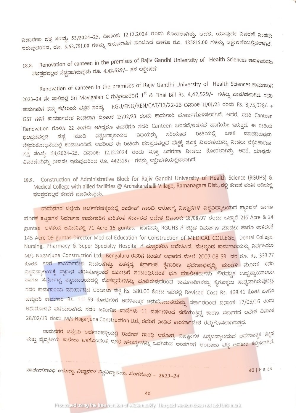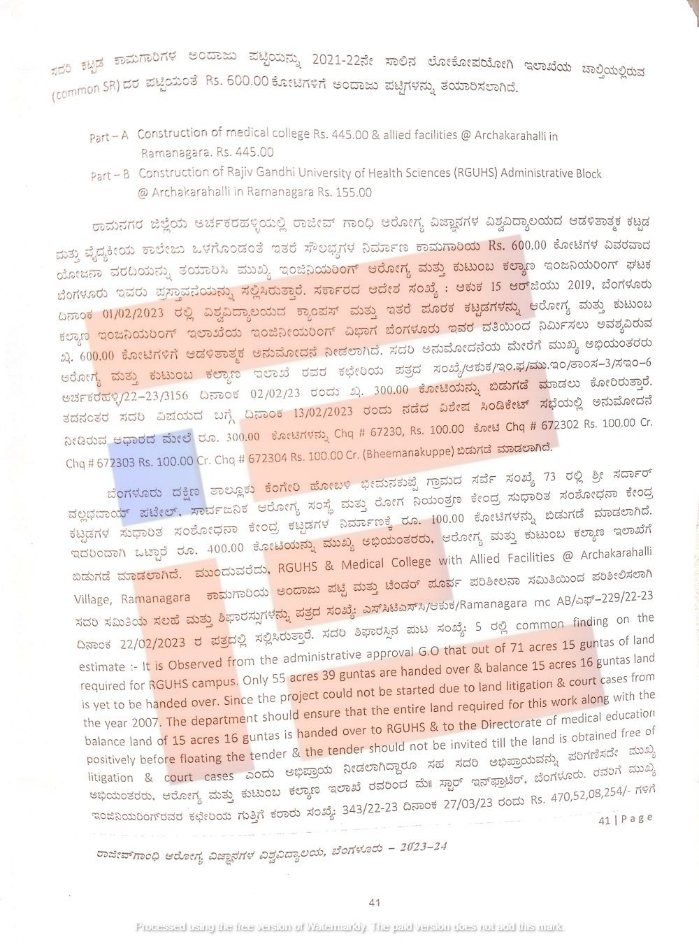 ರಾಮನಗರ ಜಿಲ್ಲೆಯ ಅರ್ಚಕರಹಳ್ಳಿಯಲ್ಲಿ ರಾಜೀವ್ ಗಾಂಧಿ ಆರೋಗ್ಯ ವಿಜ್ಞಾನಗಳ ವಿಶ್ವವಿದ್ಯಾಲಯದ ಆಡಳಿತಾತ್ಮಕ ಕಟ್ಟಡ ಮತ್ತು ವೈದ್ಯಕೀಯ ಕಾಲೇಜು ಒಳಗೊಂಡಂತೆ ಇತರೆ ಸೌಲಭ್ಯಗಳನ್ನುಒದಗಿಸುವ ಅಂಶಗಳಿಗೆ ಅಂದಾಜು ಪಟ್ಟಿ ಅವಕಾಶ ಕಲ್ಪಿಸಲಾಗಿತ್ತು. ಕಟ್ಟಡ ಕಾಮಗಾರಿಗಳ ಅಂದಾಜು ಪಟ್ಟಿಯನ್ನು 2021-22ನೇ ಸಾಲಿನ ಲೋಕೋಪಯೋಗಿ ಇಲಾಖೆಯ ಚಾಲ್ತಿಯಲ್ಲಿರುವ ದರ ಪಟ್ಟಿಯಂತೆ 600 ಕೋಟಿಗಳಿಗೆ ಅಂದಾಜು ಪಟ್ಟಿ ತಯಾರಿಸಿತ್ತು. ಈ ಬಗ್ಗೆ ಆಡಳಿತಾತ್ಮಕ ಅನುಮೋದನೆ ಕೋರಿತ್ತು.