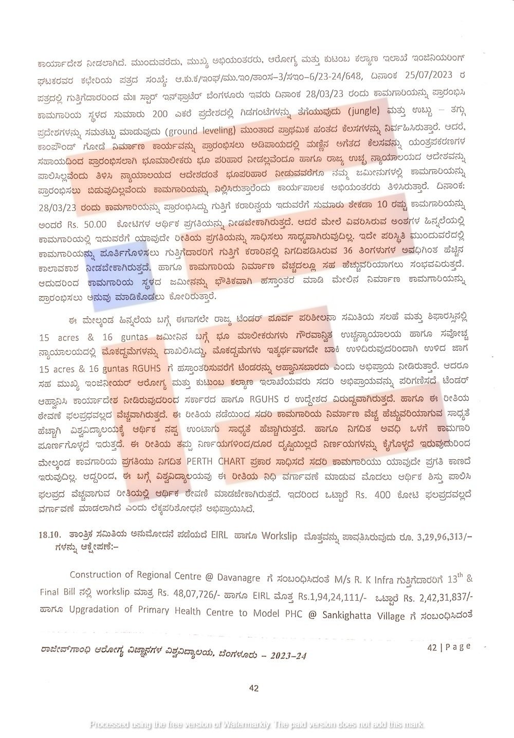 ಸದರಿ ಶಿಫಾರಸ್ಸಿನ ಪುಟ ಸಂಖ್ಯೆ: 5 ರಲ್ಲಿ common finding on the estimate – It is Observed from the administrative approval G.O that out of 71 acres 15 guntas of land required for RGUHS campus. Only 55 acres 39 guntas are handed over & balance 15 acres 16 guntas land yet to be handed over Since the project could not be started due to land litigation & court cases from the year 2007, The department should ensure that the entire land required for this work along with the balance land of 15 acres 16 guntas is handed over to RGUHS & to the Directorate of medical education positively before floating the tender & the tender should not be invited till the land is obtained free of Iltigation & court cases ಎಂದು ಅಭಿಪ್ರಾಯ ನೀಡಿತ್ತು.