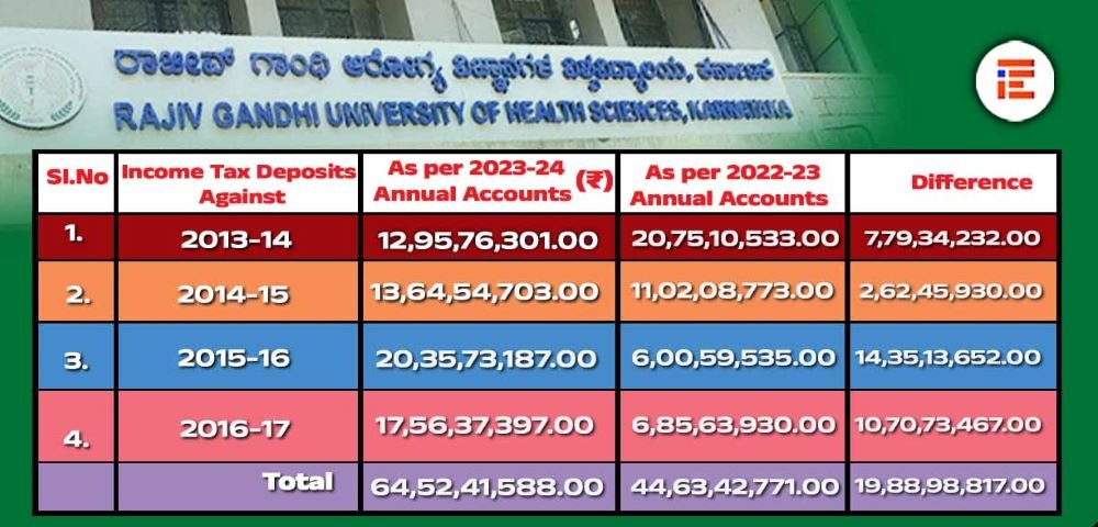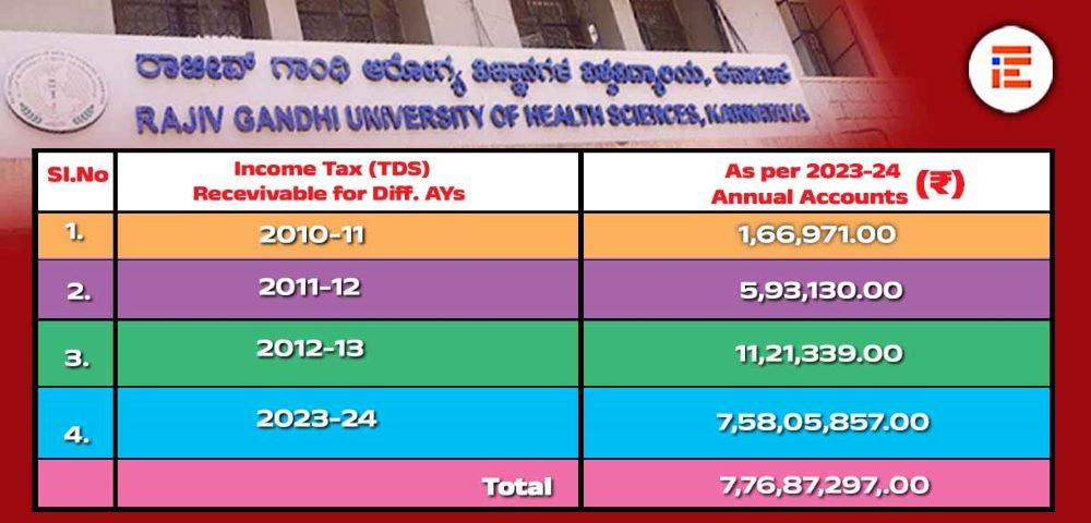 ರಾಜೀವ್ಗಾಂಧಿ ಆರೋಗ್ಯ ವಿಜ್ಞಾನಗಳ ವಿಶ್ವವಿದ್ಯಾಲಯದ 2023-24ಏಸಾಲಿನ ಅಂತ್ಯಕ್ಕೆ 7,76,87,297 ರು.ಗಳನ್ನು ಬ್ಯಾಂಕ್ ಬಡ್ಡಿಗಳ ಮೇಲಿನ ಕಟಾವಣೆಯಾದ ಆದಾಯ ತೆರಿಗೆ ಎಂದು ನಮೂದಿಸಿತ್ತು. ಈ ಆದಾಯ ತೆರಿಗೆಯನ್ನು ಹಿಂಪಡೆಯಲು ಸಂಸ್ಥೆಯು ಪ್ರತೀ ವರ್ಷ ನಿಗದಿತ ಸಮಯದಲ್ಲಿ ಆದಾಯ ತೆರಿಗೆ ರಿಟರ್ನ್ ಸಲ್ಲಿಸಿ ಹಿಂಪಡೆಯಬೇಕು. 2010-11ರಿಂದ 2013-14ನೇ ಸಾಲುಗಳ ರಿಟರ್ನ್ ಪ್ರತಿಗಳು ವಿಶ್ವವಿದ್ಯಾಲಯದಲ್ಲಿ ಲಭ್ಯವೇ ಇಲ್ಲ.