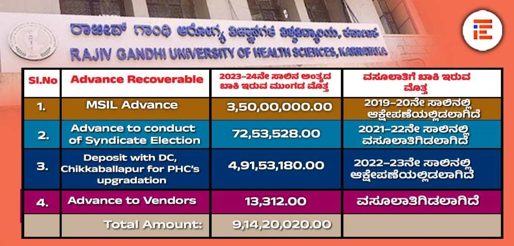 ರಾಜೀವ್ಗಾಂಧಿ ಆರೋಗ್ಯ ವಿಜ್ಞಾನಗಳ ವಿಶ್ವವಿದ್ಯಾಲಯದ 2023-24ನೇ ಸಾಲಿನ ವಾರ್ಷಿಕ ಲೆಕ್ಕಪತ್ರದ ಪ್ರಕಾರ ಮುಂಗಡಗಳನ್ನು ರಿಕವರಿ ಮಾಡಬಲ್ಲ 9,14,20.020 ರು.ಗಳನ್ನು ಒಳಗೊಂಡಿತ್ತು. ಹಲವು ಸಾಲುಗಳಿಂದಲೂ ಈ ಮೊತ್ತವನ್ನು ಬಾಕಿ ಉಳಿಸಿಕೊಂಡಿರುವ ಕುರಿತು ವಿವರಣೆಯನ್ನು ಲೆಕ್ಕ ಪರಿಶೋಧನೆಗೆ ಒದಗಿಸಬೇಕು ಎಂದು ಲೆಕ್ಕ ವಿಚಾರಣೆ ಪತ್ರ ಹೊರಡಿಸಿದ್ದರೂ ಸಹ ವಿಶ್ವವಿದ್ಯಾಲಯವು ಒದಗಿಸಿಲ್ಲ.