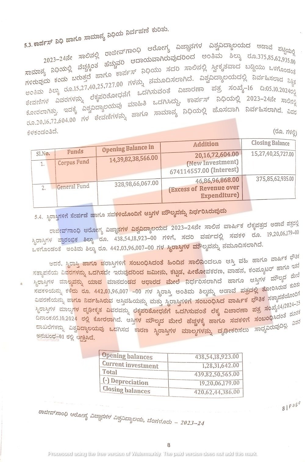 ಬೆಂಗಳೂರು; ರಾಜೀವ್ಗಾಂಧಿ ಆರೋಗ್ಯ ವಿಜ್ಞಾನಗಳ ವಿಶ್ವವಿದ್ಯಾಲಯದ 2023-24ನೇ ಸಾಲಿನ ವಾರ್ಷಿಕ ಲೆಕ್ಕಪತ್ರದ ಪ್ರಕಾರ ಸ್ಥಿರಾಸ್ತಿಗಳ ಪ್ರಾರಂಭಿಕ ಶಿಲ್ಕು 438.54 ಕೋಟಿ ರು ಗಳಿವೆ. ಇದೇ ವರ್ಷದಲ್ಲಿ 19.20 ಕೋಟಿ ರು ಸವಕಳಿ ಒಳಗೊಂಡಂತೆ ಅಂತಿಮವಾಗಿ 442.03 ಕೋಟಿ ರು ಮೌಲ್ಯದ ಸ್ಥಿರಾಸ್ತಿ ಇದೆ. ಆದರೆ ಸ್ಥಿರಾಸ್ತಿ ಹಾಗೂ ಚರಾಸ್ತಿಗಳಿಗೆ ಸಂಬಂಧಿಸಿದಂತೆ ಹಿಂದಿನ ಸಾಲಿನಿಂದಲೂ ಆಸ್ತಿ ವಹಿ ಹಾಗೂ ವಾರ್ಷಿಕ ಭೌತಿಕ ಆಸ್ತಿಗಳ ವಿವರಗಳನ್ನು ಒದಗಿಸಿಲ್ಲ.