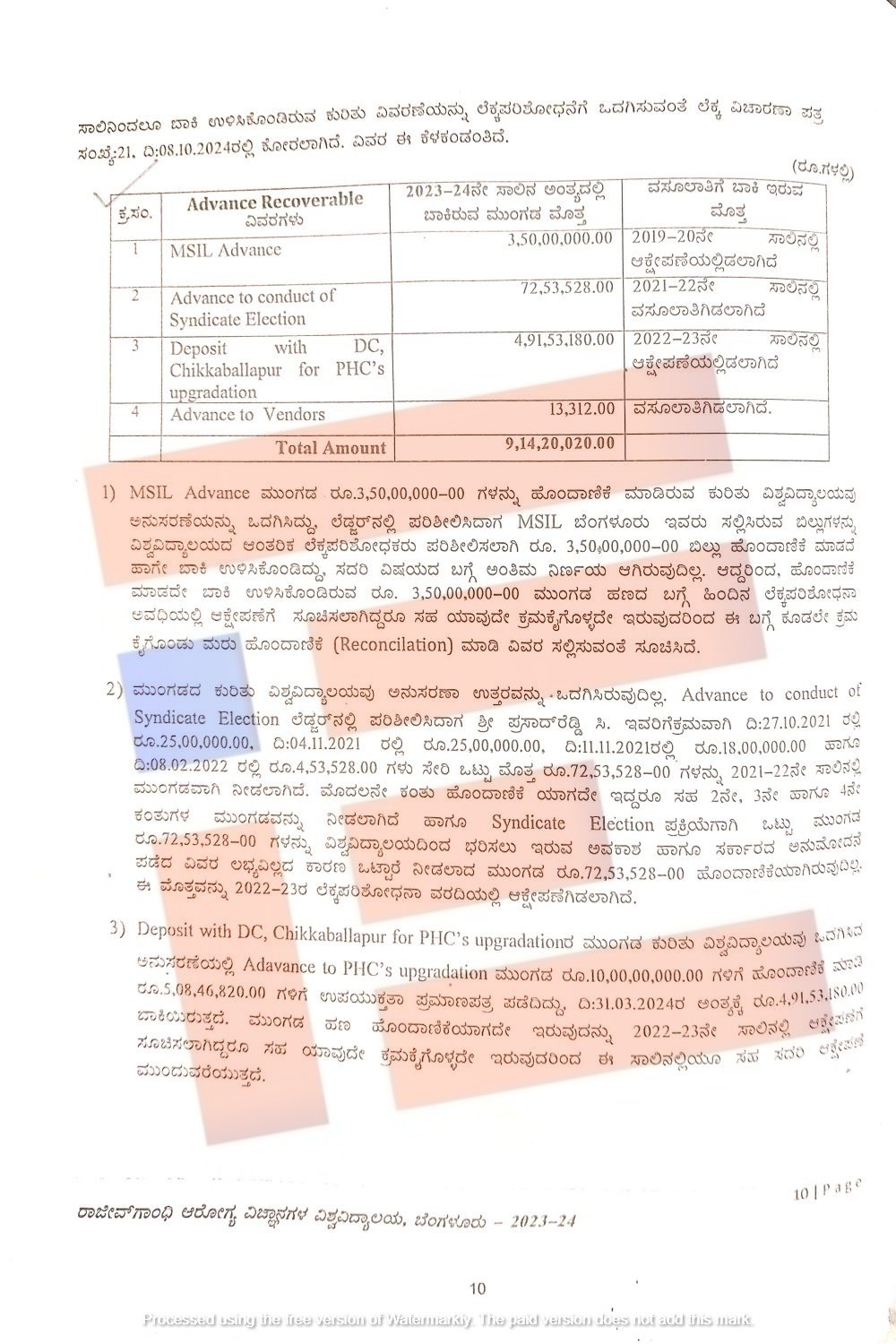 2024ರ ಮಾರ್ಚ್ 31ರ ಅಂತ್ಯಕ್ಕೆ 4,91,53,180 ರು.ಗಳು ಬಾಕಿ ಇತ್ತು. ಮುಂಗಡ ಹಣ ಹೊಂದಾಣಿಕೆಯಾಗದೇ ಇರುವುದನ್ನು 2022-23ನೇ ಸಾಲಿನಲ್ಲಿಯೇ ಆಕ್ಷೇಪಣೆಗೆ ಸೂಚಿಸಿತ್ತು. ಆದರೂ ಸಹ ವಿಶ್ವವಿದ್ಯಾಲಯವು ಯಾವುದೇ ಕ್ರಮ ವಹಿಸಿಲ್ಲ. ಈ ಸಾಲಿನಲ್ಲಿಯೂ ಈ ಮೊತ್ತವನ್ನೂ 2022-23ನೇ ಸಾಲಿನಲ್ಲಿ ಆಕ್ಷೇಪಣೆಯಲ್ಲಿಟ್ಟಿದೆ. ಅದೇ ರೀತಿ ವೆಂಡರ್ಸ್ಗಳಿಗೆ ನೀಡಿದ್ದ 13,312 ರು.ಗಳನ್ನೂ ಸಹ ವಸೂಲಾತಿಗಿಟ್ಟಿದೆ.