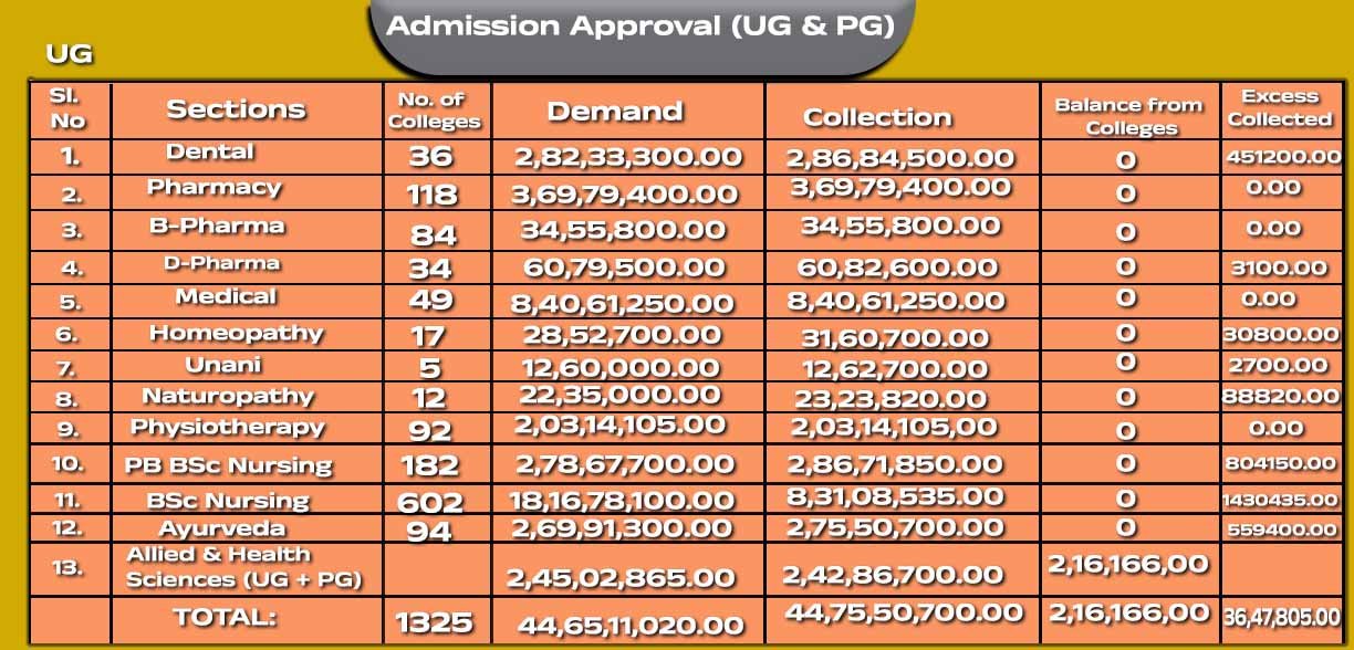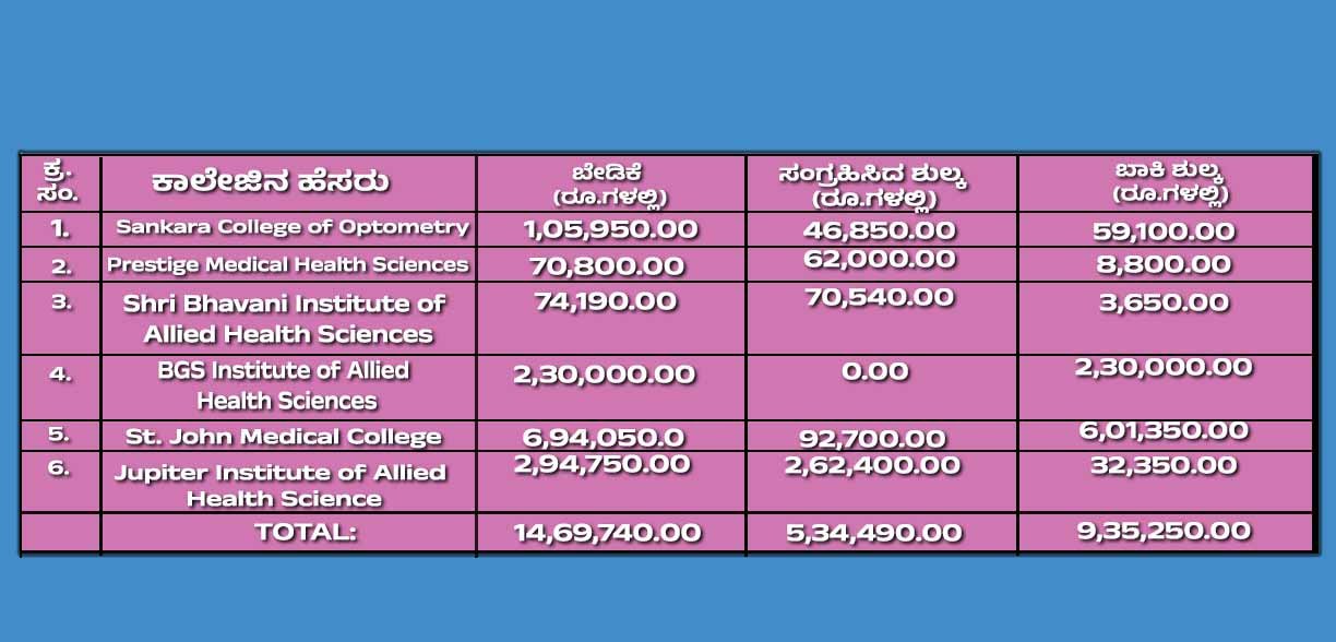 ಬಿಜಿಎಸ್ ಅಲೈಡ್ ಹೆಲ್ತ್ ಸೈನ್ಸ್ ನಿಂದ 2,30,000 ರು ಬೇಡಿಕೆ ಇತ್ತು. ಈ ಪೈಕಿ ನಯಾ ಪೈಸೆಯನ್ನೂ ಸಂಗ್ರಹಿಸಿರಲಿಲ್ಲ. ಹೀಗಾಗಿ 2,30,000 ರು ಬಾಕಿ ಇತ್ತು. ಸೇಂಟ್ ಜಾನ್ ಮೆಡಿಕಲ್ ಕಾಲೇಜಿನಿಂದ 6,94,050 ರು ಬೇಡಿಕೆ ಇತ್ತು. ಇದರಲ್ಲಿ 92,700 ರು ಮಾತ್ರ ಸಂಗ್ರಹಿಸಿತ್ತು. ಇನ್ನೂ 6,01,350 ರು ಬಾಕಿ ಇತ್ತು. ಜ್ಯುಪಿಟರ್ ಇನ್ಸಿಟಿಟ್ಯೂಟ್ ಆಫ್ ಅಲೈಡ್ ಹೆಲ್ತ್ ಸೈನ್ಸ್ ಕಾಲೇಜಿನಿಂದ 2,94,750 ರು ಬೇಡಿಕೆ ಇತ್ತು. ಈ ಪೈಕಿ 2,62,400 ರು ಸಂಗ್ರಹವಾಗಿತ್ತು. 32,350 ಗಳಿಂದ ಅನುಮೋದನೆ ಶುಲ್ಕ ಬಾಕಿ ಇರುವುದು ಗೊತ್ತಾಗಿದೆ.