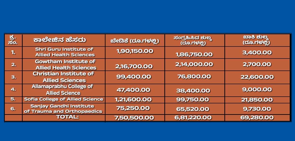 ಅಲ್ಲಮಪ್ರಭು ಕಾಲೇಜ್ ಆಫ್ ಅಲೈಡ್ ಸೈನ್ಸ್ 47,400 ಬೇಡಿಕೆ ಇತ್ತು. ಈ ಪೈಕಿ 38,400 ರು ಸಂಗ್ರಹವಾಗಿತ್ತು. ಇನ್ನೂ 9,000 ರು ಬಾಕಿ ಇತ್ತು. ಸೋಫಿಯಾ ಕಾಲೇಜ್ ಆಫ್ ಅಲೈಡ್ ಸೈನ್ಸ್ ಕಾಲೇಜಿನಿಂದ 1,21,600 ರು ಬೇಡಿಕೆ ಇತ್ತು. ಈ ಪೈಕಿ 99,750 ರು ಸಂಗ್ರಹಿಸಲಾಗಿತ್ತು. ಇನ್ನೂ 21,850 ರು ಬಾಕಿ ಇತ್ತು.