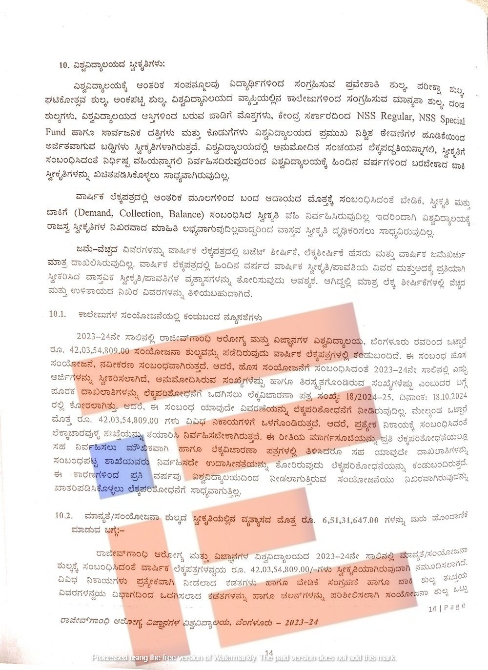 2023-24ನೇ ಸಾಲಿನಲ್ಲಿ ರಾಜೀವ್ ಗಾಂಧಿ ಆರೋಗ್ಯ ವಿಜ್ಞಾನಗಳ ವಿಶ್ವವಿದ್ಯಾಲಯವು ಒಟ್ಟಾರೆ 42,03,54,809 ರುಗ.ಳನ್ನು ಸಂಯೋಜನಾ ಶುಲ್ಕವನ್ನು ಪಡೆದಿದೆ. ಈ ಸಂಬಂಧ ಹೊಸ ಸಂಯೋಜನೆ, ನವೀಕರಣಕ್ಕೆ ಸಂಬಂಧಿಸಿದ ಶುಲ್ಕವಾಗಿತ್ತು. ಆದರೆ ಹೊಸ ಸಂಯೋಜನೆಗೆ ಸಂಬಂಧಿಸಿದಂತೆ 2023-24ನೇ ಸಾಲಿನಲ್ಲಿ ಎಷ್ಟು ಅರ್ಜಿಗಳನ್ನು ಸ್ವೀಕರಿಸಲಾಗಿದೆ, ಅನುಮೋದಿಸಿರುವ ಸಂಖ್ಯೆಗಳೆಷ್ಟು ಹಾಗೂ ತಿರಸ್ಕೃತಗೊಂಡಿರುವ ಸಂಖ್ಯೆಗಳೆಷ್ಟು ಎಂಬುದರ ಬಗ್ಗೆ ಪೂರಕ ದಾಖಲೆಗಳನ್ನು ಲೆಕ್ಕ ಪರಿಶೋಧನೆಗೆ ಒದಗಿಸಿಲ್ಲ ಎಂಬುದು ವರದಿಯಿಂದ ತಿಳಿದು ಬಂದಿದೆ.