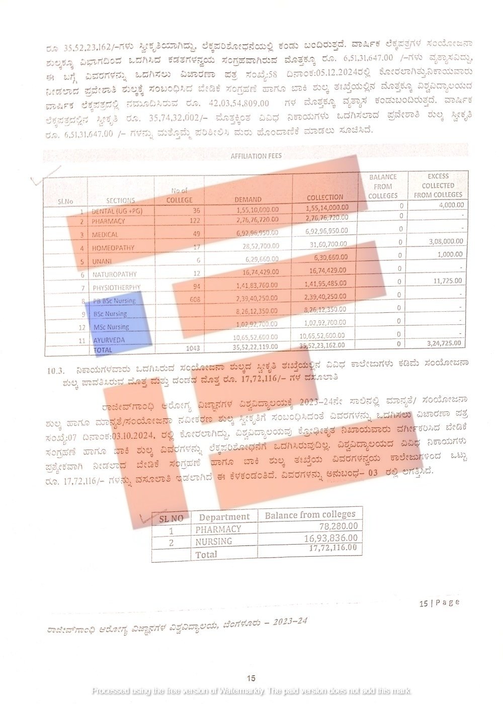 ಅಲ್ಲದೆ 2023-24ನೇ ಸಾಲಿನಲ್ಲಿ ಮಾನ್ಯತೆ, ಸಂಯೋಜನೆ ಶುಲ್ಕಕ್ಕೆ ಸಂಬಂಧಿಸಿದಂತೆ ವಾರ್ಷಿಕ ಲೆಕ್ಕಪತ್ರಗಳ ಅನ್ವಯ 42,03,54,809 ರು.ಗಳು ಸ್ವೀಕೃತಿಯಾಗಿದೆ ಎಂದು ನಮೂದಿಸಲಾಗಿದೆ. ವಿವಿಧ ನಿಕಾಯಗಳು ಪ್ರತ್ಯೇಕವಾಗಿ ನೀಡಲಾದ ಕಡತಗಳು ಮತ್ತು ಬೇಡಿಕೆ ಸಂಗ್ರಹಣೆ, ಬಾಕಿ ಶುಲ್ಕ ತಃಖ್ತೆಯ ವಿವರಗಳನ್ನು ವಿಭಾಗದಿಂದ ಒದಗಿಸಲಾಘದ ಕಡತಗಳನ್ನು, ಚಲನ್ಗಳನ್ಉ ಪರಿಶೀಲಿಸಲಾಗಿದೆ. ಇದರ ಪ್ರಕಾರ ಸಂಯೋಜನೆ ಶುಲ್ಕ ಒಟ್ಟು 35,52,23,162 ರು.ಗಳು ಸ್ವೀಕೃತವಾಗಿರುವುದನ್ನು ಲೆಕ್ಕ ಪರಿಶೋಧನೆ ವೇಳೆಯಲ್ಲಿ ಕಂಡು ಹಿಡಿದಿದೆ.