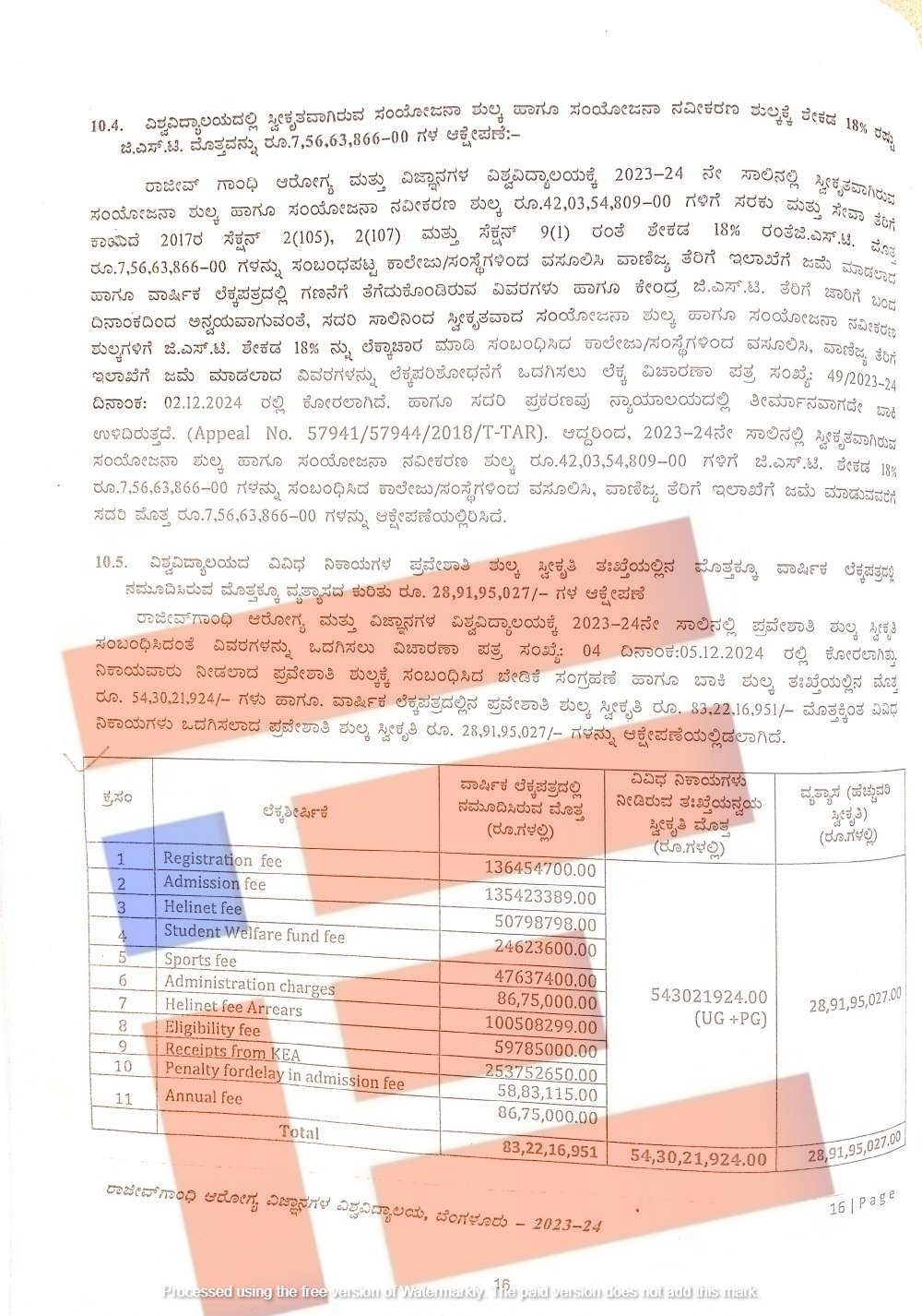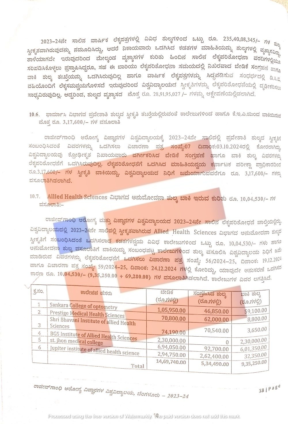ಹೀಗಾಗಿ ಜಿಎಸ್ಟಿ ಮೊತ್ತವಾಗಿರುವ 7,56,63,866 ರುಗ.ಳನ್ನು ಸಂಬಂಧಿಸಿದ ಕಾಲೇಜುಗಳಿಂದ ವಸೂಲು ಮಾಡಿ ವಾಣಿಜ್ಯ ತೆರಿಗೆ ಇಲಾಖೆಗೆ ಜಮೆ ಮಾಡುವವರೆಗೂ ಈ ಮೊತ್ತವನ್ನು ಲೆಕ್ಕ ಪರಿಶೋಧಕರು ಆಕ್ಷೇಪಣೆಯಲ್ಲಿಟ್ಟಿರುವುದು ತಿಳಿದು ಬಂದಿದೆ.