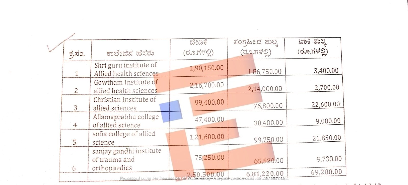 ಹಾಗೆಯೇ ಶ್ರೀ ಗುರು ಇನ್ಸಿಟಿಟ್ಯೂಟ್ ಆಫ್ ಅಲೈಡ್ ಹೆಲ್ತ್ ಸೈನ್ಸ್ ಕಾಲೇಜಿನಿಂದ 1,90,150 ರು ಬೇಡಿಕೆ ಇತ್ತು. ಈ ಪೈಕಿ 1,86,750 ರು ಸಂಗ್ರಹಿಸಲಾಗಿತ್ತು. ಬಾಕಿ 3,400 ರು ಇತ್ತು. ಗೌತಮ್ ಇನ್ಸಿಟಿಟ್ಯೂಟ್ ಆಫ್ ಅಲೈಡ್ ಹೆಲ್ತ್ ಸೈನ್ಸ್ನಿಂದ 2,16,700 ರು ಬೇಡಿಕೆ ಇತ್ತಾದರೂ ಈ ಪೈಕಿ 2,14,000 ರು ಸಂಗ್ರಹಿಸಿತ್ತು. ಇನ್ನೂ 2,700 ರು ಬಾಕಿ ಇತ್ತು. ಕ್ರಿಶ್ಚಿಯನ್ ಇನ್ಸಿಟಿಟ್ಯೂಟ್ ಆಫ್ ಅಲೈಡ್ ಸೈನ್ಸ್ನಿಂದ 99,400 ರು ಬೇಡಿಕೆ ಇತ್ತು. ಈ ಪೈಕಿ 76,800 ರು ಸಂಗ್ರಹವಾಗಿತ್ತು. ಇನ್ನೂ 22,600 ರು ಬಾಕಿ ಇತ್ತು.
