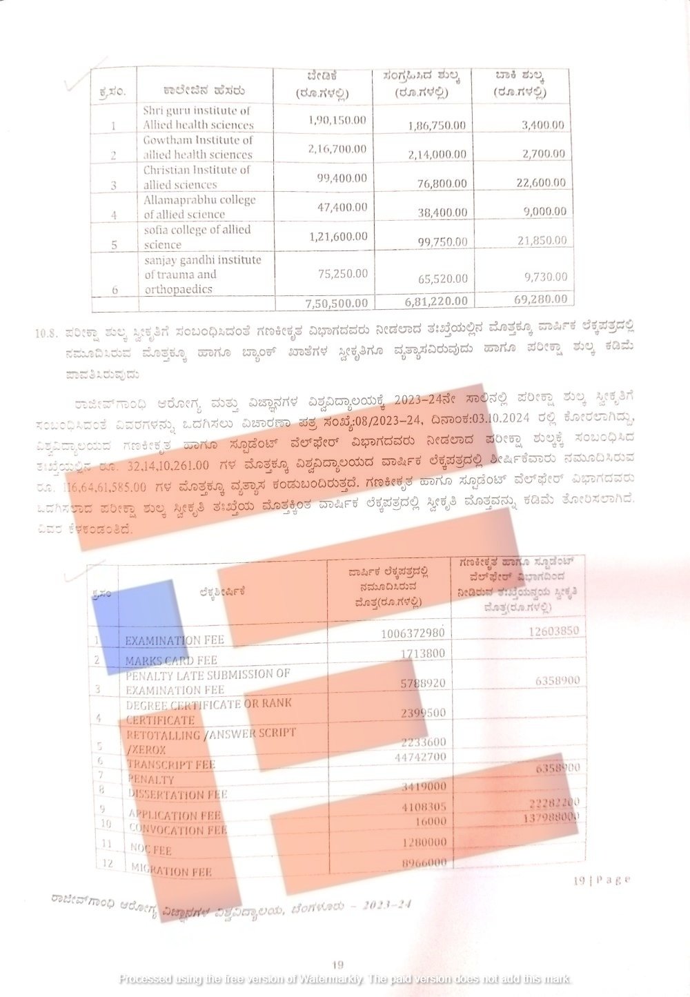ಅರ್ಹತಾ ಶುಲ್ಕವು ವಾರ್ಷಿಕ ಲೆಕ್ಕಪತ್ರದ ಪ್ರಕಾರ 5,97,85,000 ರು ಇತ್ತು. ವಿದ್ಯಾರ್ಥಿ ಕಲ್ಯಾಣ ವಿಭಾಗವು ಯಾವುದೇ ಲೆಕ್ಕವನ್ನು ಕೊಟ್ಟಿರಲಿಲ್ಲ. ವಿಷಯ ಶುಲ್ಕವು 13,57,07, 000 ರು ಇತ್ತು. ಪುನರಾವರ್ತಿತ ವಿದ್ಯಾರ್ಥಿಗಳ ಅರ್ಜಿ ಶುಲ್ಕವು 1,14,411 ರು ಇತ್ತು. ಹೆಸರು ಬದಲಾವಣೆಗೆ 12,78,3,080 ರು ಇತ್ತು. ಪರೀಕ್ಷಾ ಶುಲ್ಕದ ಹೆಚ್ಚುವರಿ ಶುಲ್ಕವು 12,85,2,700 ರು ಇತ್ತು. ಒಟ್ಟಾರೆ ವಾರ್ಷಿಕ ಲೆಕ್ಕ ಪತ್ರದ ಪ್ರಕಾರ 116,64,61, 585 ರು ಇತ್ತು. ಆದರೆ ವಿದ್ಯಾರ್ಥಿ ಕ್ಷೇಮ ಕಲ್ಯಾಣ ವಿಭಾಗದ ಪ್ರಕಾರ 32,14,10, 261 ರು ಇತ್ತು.