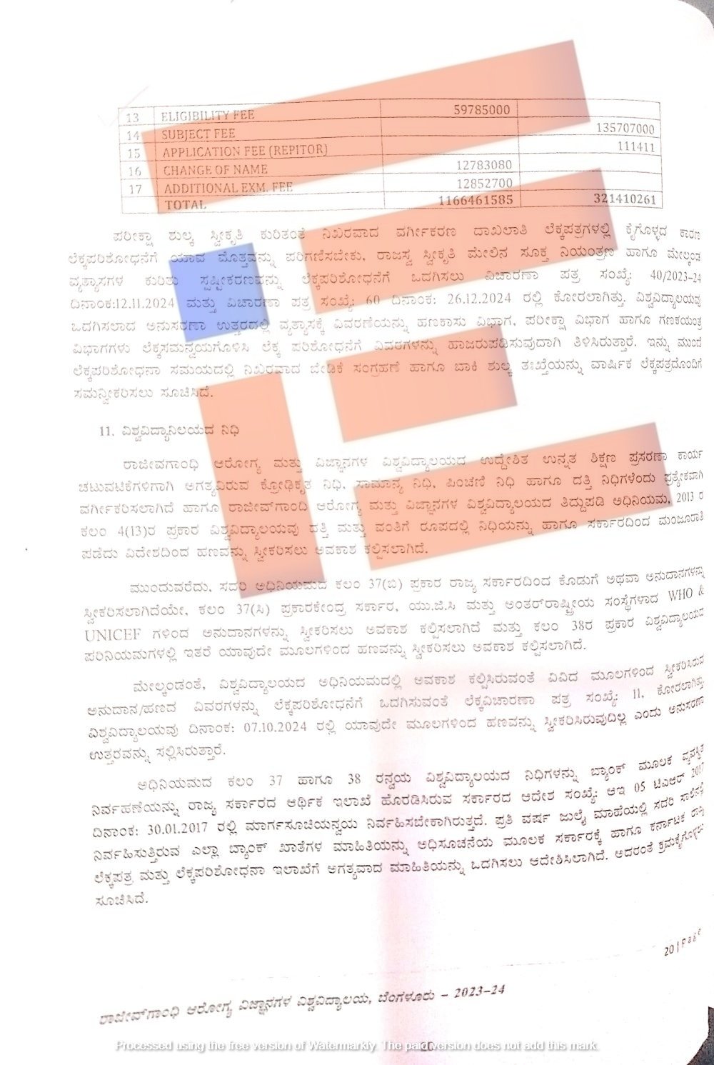 ಬೆಂಗಳೂರು; ರಾಜೀವ್‌ಗಾಂಧಿ ಆರೋಗ್ಯ ವಿಜ್ಞಾನಗಳ ವಿಶ್ವವಿದ್ಯಾಲಯವು ಪರೀಕ್ಷಾ ಶುಲ್ಕ ಸ್ವೀಕೃತಿಗೆ ಸಂಬಂಧಿಸಿದಂತೆ ಗಣಕೀಕೃತ ವಿಭಾಗವು ನೀಡಿದ್ದ ತಃಖ್ತೆಯಲ್ಲಿನ ಮೊತ್ತಕ್ಕೂ ವಾರ್ಷಿಕ ಲೆಕ್ಕಪತ್ರದಲ್ಲಿ ನಮೂದಿಸಿರುವ ಮೊತ್ತಕ್ಕೂ ಹಾಗೂ ಬ್ಯಾಂಕ್‌ ಖಾತೆಗಳ ಸ್ವೀಕೃತಿಗೂ ವ್ಯತ್ಯಾಸವಿದೆ. ಅಲ್ಲದೇ ಪರೀಕ್ಷಾ ಶುಲ್ಕದಲ್ಲಿ ಕಡಿಮೆ ಪಾವತಿಸಿರುವುದನ್ನೂ ಲೆಕ್ಕಪರಿಶೋಧಕರು ಪತ್ತೆ ಹಚ್ಚಿದ್ದಾರೆ.