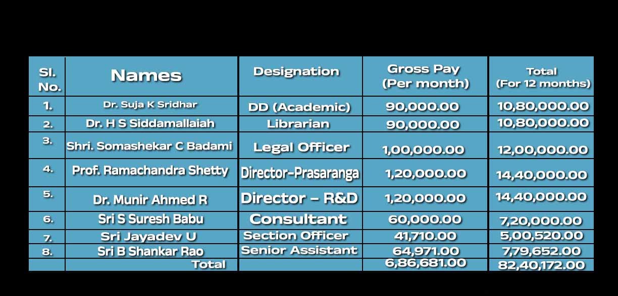 ಡಾ ಸುಜಾ ಕೆ ಶ್ರೀಧರ್‍‌ ಅವರಿಗೆ ತಿಂಗಳಿಗೆ 90,000ರು ಡಾ ಹೆಚ್‌ ಎಸ್‌ ಸಿದ್ದಮಲ್ಲಯ್ಯ ಅವರಿಗೆ 90,000 ರು, ಸೋಮಶೇಖರ್ ಸಿ ಬದಾಮಿಗೆ 1,00,000.00, ಪ್ರೊ.ರಾಮಚಂದ್ರ ಶೆಟ್ಟಿ ಅವರಿಗೆ 1,20,000 ರು., , ಡಾ ಮುನೀರ್ ಅಹ್ಮದ್‌ ಅವರಿಗೆ 1,20,000 ರು., ಎಸ್‌ ಸುರೇಶ್‌ ಬಾಬು ಅವರಿಗೆ 60,000 ರು., ಯು ಜಯದೇವ ಅವರಿಗೆ 41,710 ರು., ಬಿ ಶಂಕರ್ ರಾವ್ ಅವರಿಗೆ 64,971 ರು ಪಾವತಿಸಿತ್ತು.