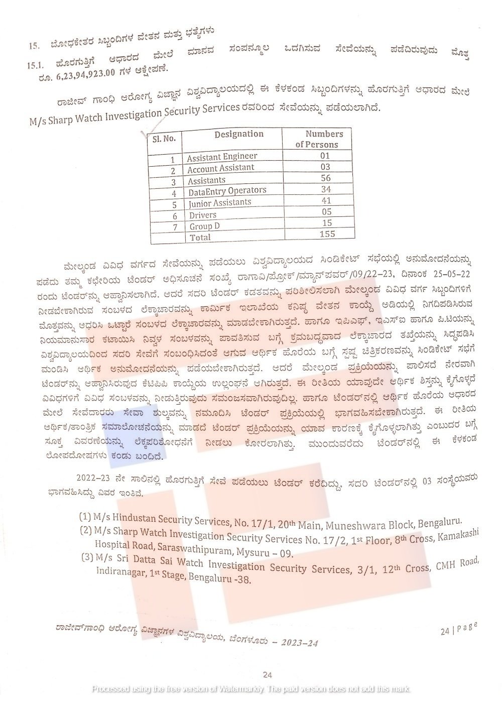 2022-23ನೇ ಸಾಲಿನಲ್ಲಿ ಹೊರಗುತ್ತಿಗೆ ಸೇವೆ ಪಡೆಯಲು ಕರೆದಿದ್ದ ಟೆಂಡರ್‍‌ನಲ್ಲಿ ಮೂರು ಸಂಸ್ಥೆಗಳು ಭಾಗವಹಿಸಿದ್ದವು. ಬೆಂಗಳೂರಿನ ಹಿಂದೂಸ್ತಾನ್‌ ಸೆಕ್ಯುರಿಟಿ ಸರ್ವೀಸ್‌, ಮೈಸೂರಿನ ಶಾರ್ಪ್ ಇನ್ವೆಷ್ಟಿಗೇಷನ್‌ ಸೆಕ್ಯುರಿಟಿ ಸರ್ವಿಸ್‌, ಶ್ರೀ ದತ್ತ ಸಾಯಿ ವಾಚ್‌ ಇನ್ವೆಷ್ಟಿಗೇಷನ್‌ ಸೆಕ್ಯೂರಿಟಿ ಸರ್ವೀಸ್ ಭಾಗವಹಿಸಿದ್ದವು.