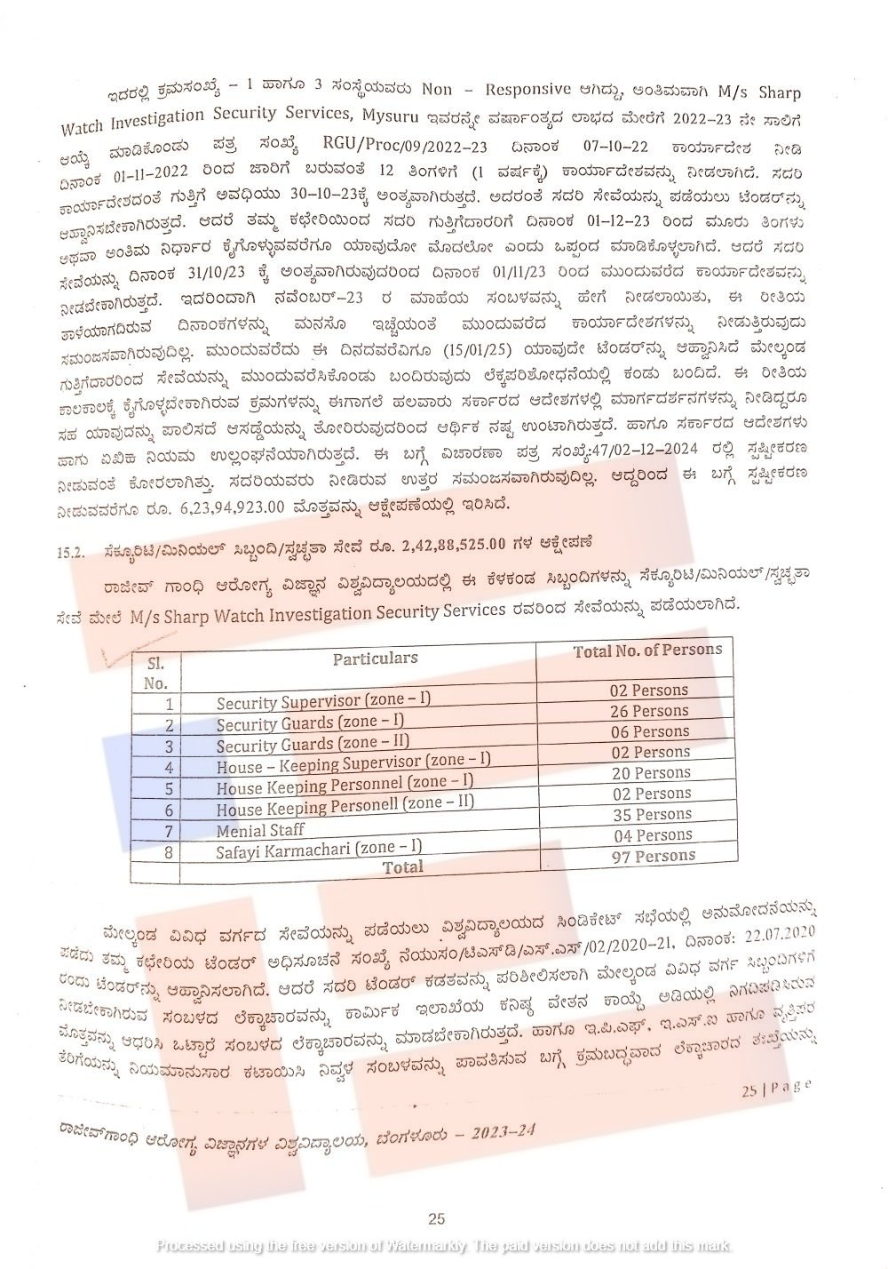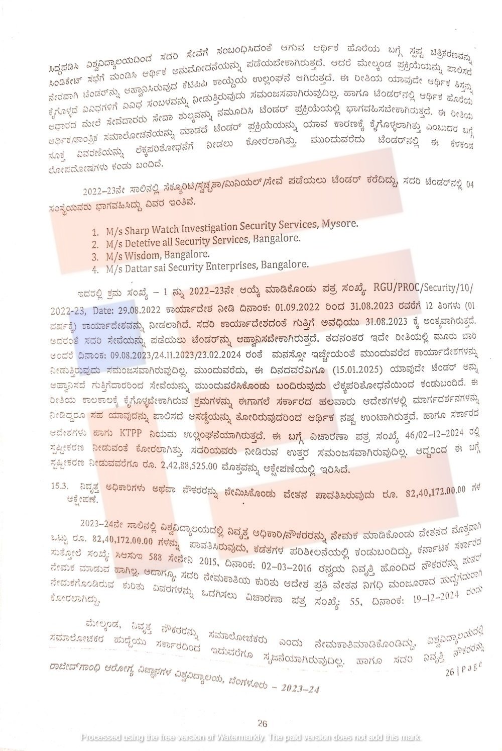 ಈ ಪೈಕಿ ಮೂರೂ ಸಂಸ್ಥೆಗಳು ನಾನ್‌ ರೆಸ್ಪಾನ್ಸೀವ್‌ ಆಗಿದ್ದವು. ಅಂತಿಮವಾಗಿ ಶಾರ್ಪ್ ವಾಚ್‌ ಇನ್ವೆಸ್ಟಿಗೇಷನ್‌ ಸೆಕ್ಯೂರಿಟಿ ಸರ್ವಿಸ್‌ ನ್ನೇ ವರ್ಷಾಂತ್ಯದ ಲಾಭದ ಮೇರೆಗೆ 2022-23ನೇ ಸಾಲಿಗೆ ಆಯ್ಕೆ ಮಾಡಿಕೊಂಡಿತ್ತು. 2022ರ ಅಕ್ಟೋಬರ್‍‌ 7ರಂದು ಕಾರ್ಯಾದೇಶ ನೀಡಲಾಗಿತ್ತು. ಈ ಕಾರ್ಯಾದೇಶದ ಪ್ರಕಾರ ಗುತ್ತಿಗೆ ಅವಧಿಯು 2023ರ ಅಕ್ಟೋಬರ್‍‌ 30ಕ್ಕೆ ಮುಕ್ತಾಯಗೊಳ್ಳಬೇಕು. ಹೀಗಾಗಿ ಈ ಸೇವೆಗಳಿಗಾಗಿ ಪುನಃ ಟೆಂಡರ್‍‌ ಆಹ್ವಾನಿಸಬೇಕಿತ್ತು ಎಂದು ವರದಿಯಲ್ಲಿ ವಿವರಿಸಲಾಗಿದೆ.