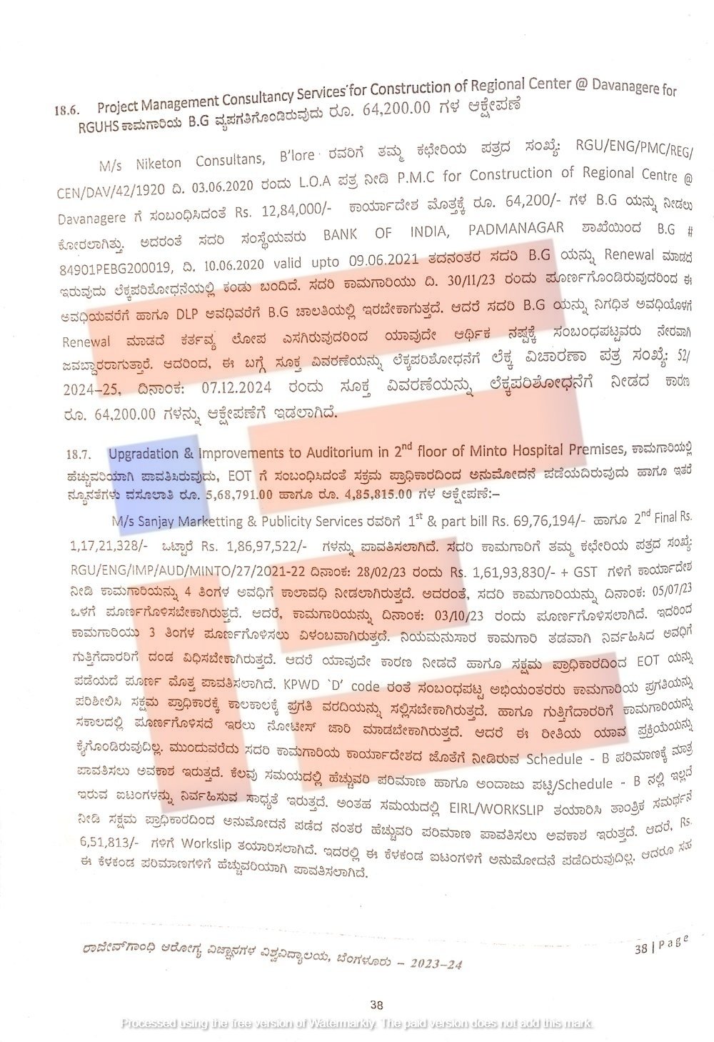 ಬೆಂಗಳೂರು; ಆರೋಗ್ಯ ಮತ್ತು ಕುಟುಂಬ ಕಲ್ಯಾಣ ಇಲಾಖೆಯ ವ್ಯಾಪ್ತಿಯಲ್ಲಿರುವ ಮಿಂಟೋ ಆಸ್ಪತ್ರೆ ಕಾಮಗಾರಿ ನಡೆಸಿದ್ದ ರಾಜೀವ್ಗಾಂಧಿ ಆರೋಗ್ಯ ವಿಜ್ಞಾನಗಳ ವಿಶ್ವವಿದ್ಯಾಲಯವು, ಈ ಕಾಮಗಾರಿಗಳಿಗೆ ಅನುಮೋದನೆಯಿಲ್ಲದೆಯೇ ಹೆಚ್ಚುವರಿ ಪಾವತಿ ಮಾಡಿರುವುದನ್ನು ಲೆಕ್ಕ ಪರಿಶೋಧಕರು ಬಹಿರಂಗಗೊಳಿಸಿದ್ದಾರೆ.