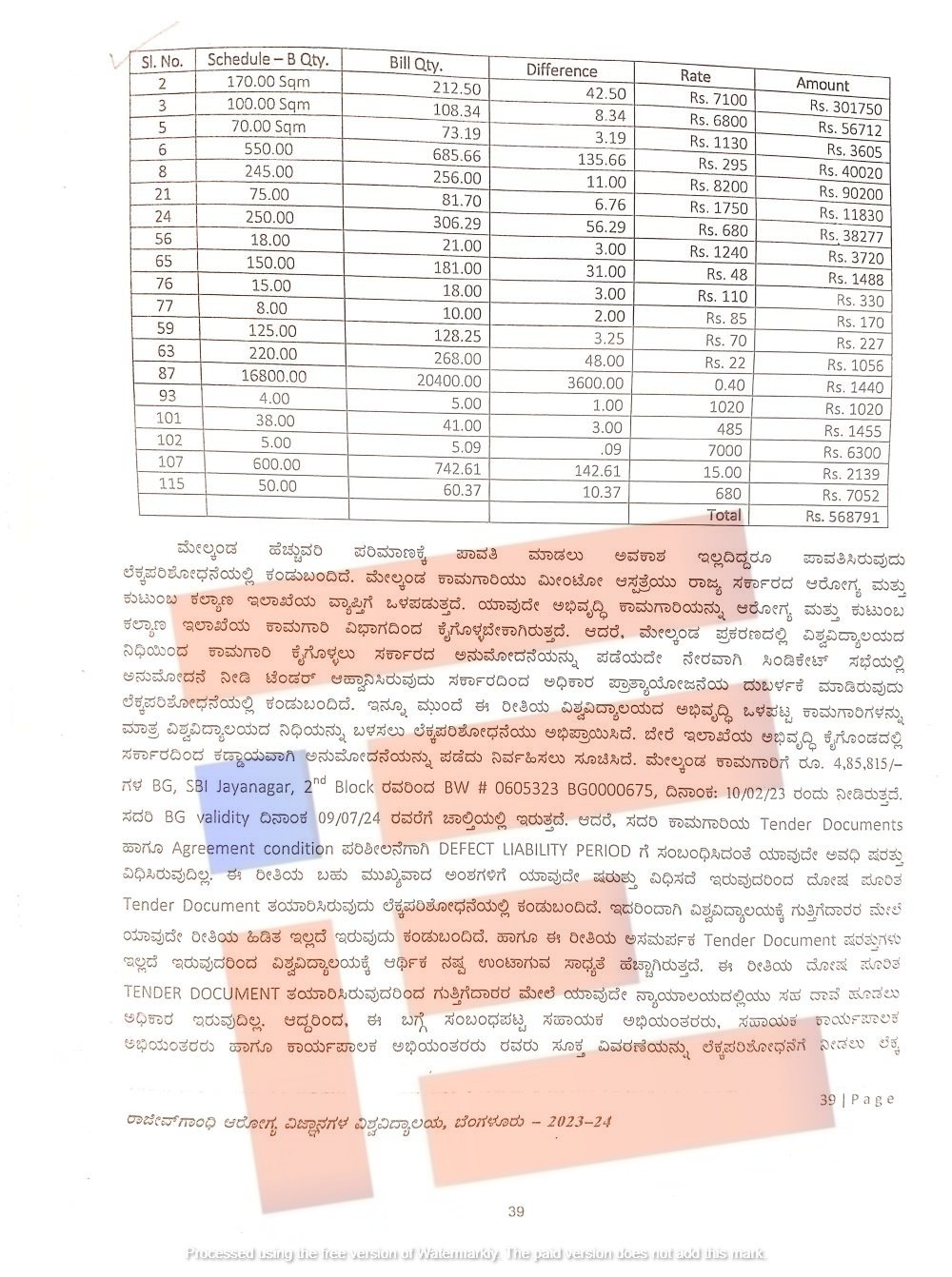 ಮುಂದುವರೆದು ಸದರಿ ಕಾಮಗಾರಿಯ ಕಾರ್ಯಾದೇಶದ ಜತೆಗೆ ನೀಡಿರುವ ಷೆಡ್ಯೂಲ್ಡ್ ಬಿ ಪರಿಮಾಣಕ್ಕೆ ಮಾತ್ರ ಪಾವತಿಸಲು ಅವಕಾಶವಿದೆ. ಕೆಲವು ಸಮಯದಲ್ಲಿ ಹೆಚ್ಚುವರಿ ಪರಿಮಾಣ ಹಾಗೂ ಅಂದಾಜು ಪಟ್ಟಿ ಷೆಡ್ಯೂಲ್ಡ್ ಬಿ ನಲ್ಲಿ ಇಲ್ಲದೆ ಇರುವ ಐಟಂಗಳನ್ನು ನಿರ್ವಹಿಸುವ ಸಾಧ್ಯತೆ ಇರುತ್ತದೆ. ಅಂತಹ ಸಮಯದಲ್ಲಿ ಇಐಆರ್ಎಲ್, ವರ್ಕ್ ಸ್ಲಿಪ್ ತಯಾರಿಸಿ ತಾಂತ್ರಿಕ ಸಮರ್ಥನೆ ನೀಡಿ ಸಕ್ಷಮ ಪ್ರಾಧಿಕಾರದಿಂದ ಅನುಮೋದನೆ ಪಡೆದ ನಂತರ ಹೆಚ್ಚುವರಿ ಪರಿಮಾಣ ಪಾವತಿಸಲು ಅವಕಾಶವಿದೆ. ಆಧರೆ 6,51,813 ರ.ಗಳಿಗೆ ವರ್ಕ್ ಸ್ಲಿಪ್ ತಯಾರಿಸಲಾಗಿದೆ.