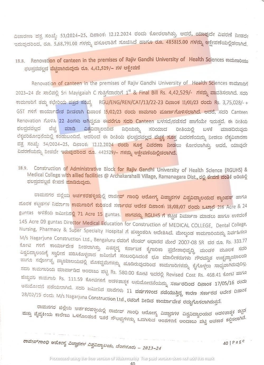 2023-24ನೇ ಸಾಲಿನ ಲೆಕ್ಕ ಪರಿಶೋಧನೆ ವರದಿಯನ್ನು ಪೂರ್ಣಗೊಳಿಸಿರುವ ಕರ್ನಾಟಕ ರಾಜ್ಯ ಲೆಕ್ಕಪತ್ರ ಮತ್ತು ಲೆಕ್ಕ ಪರಿಶೋಧನೆ ಇಲಾಖೆಯು, ಅನುಮೋದನೆಯಿಲ್ಲದೆಯೇ ವಿಶ್ವವಿದ್ಯಾಲಯವು ನಡೆಸಿರುವ ಕಾಮಗಾರಿಗಳ ವಿವರಗಳನ್ನು ಬಯಲು ಮಾಡಿದ್ದಾರೆ.