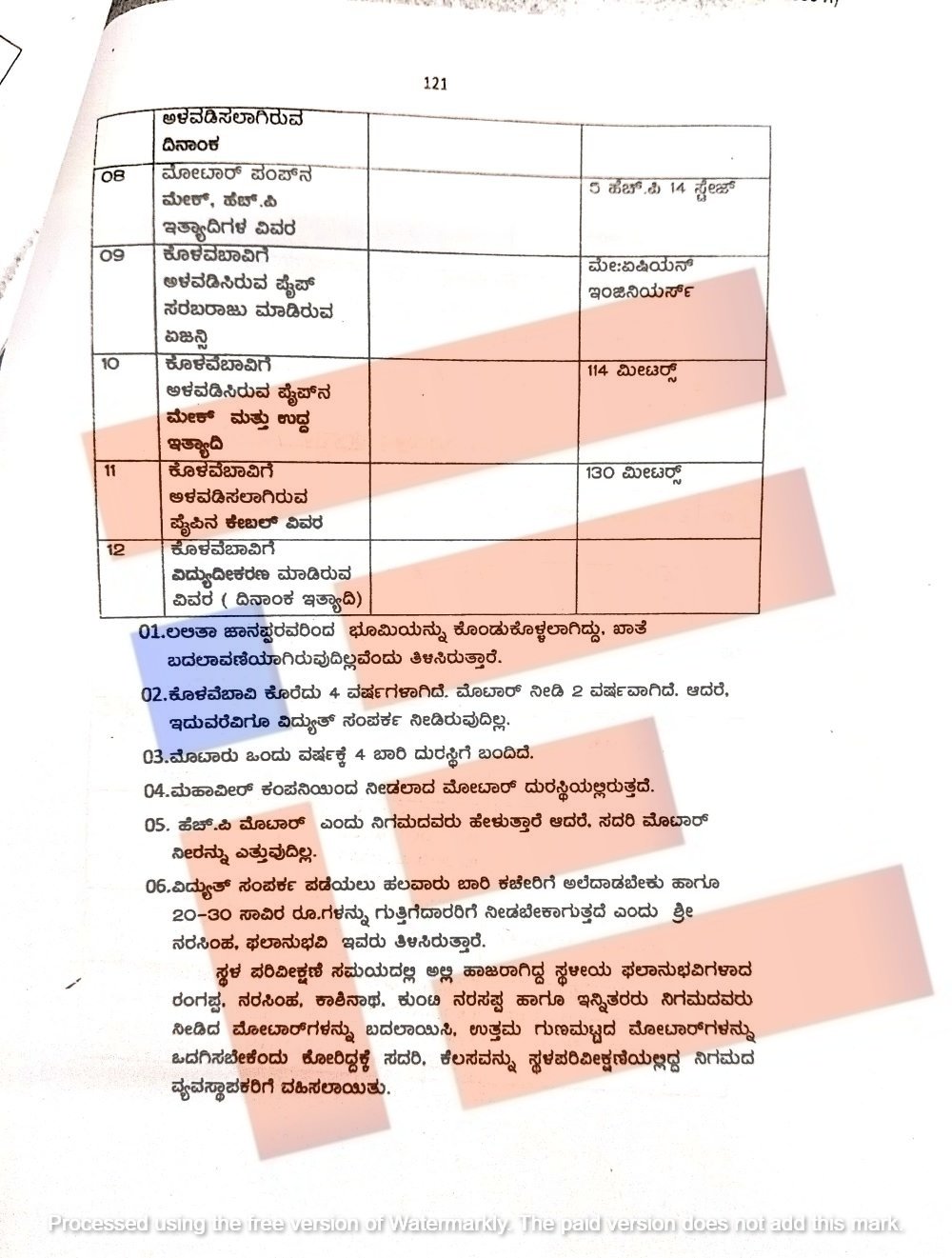 ಅದೇ ರೀತಿ ಕೊರೆಯಲಾಗಿದ್ದ ಕೊಳವೆಬಾವಿಗಳಿಗೆ ಪಂಪ್ಸೆಟ್ಗಳನ್ನು ಸರಬರಾಜು ಮಾಡಲು ಸಹ ಕಾರ್ಯಾದೇಶ ನೀಡಲಾಗಿತ್ತು.