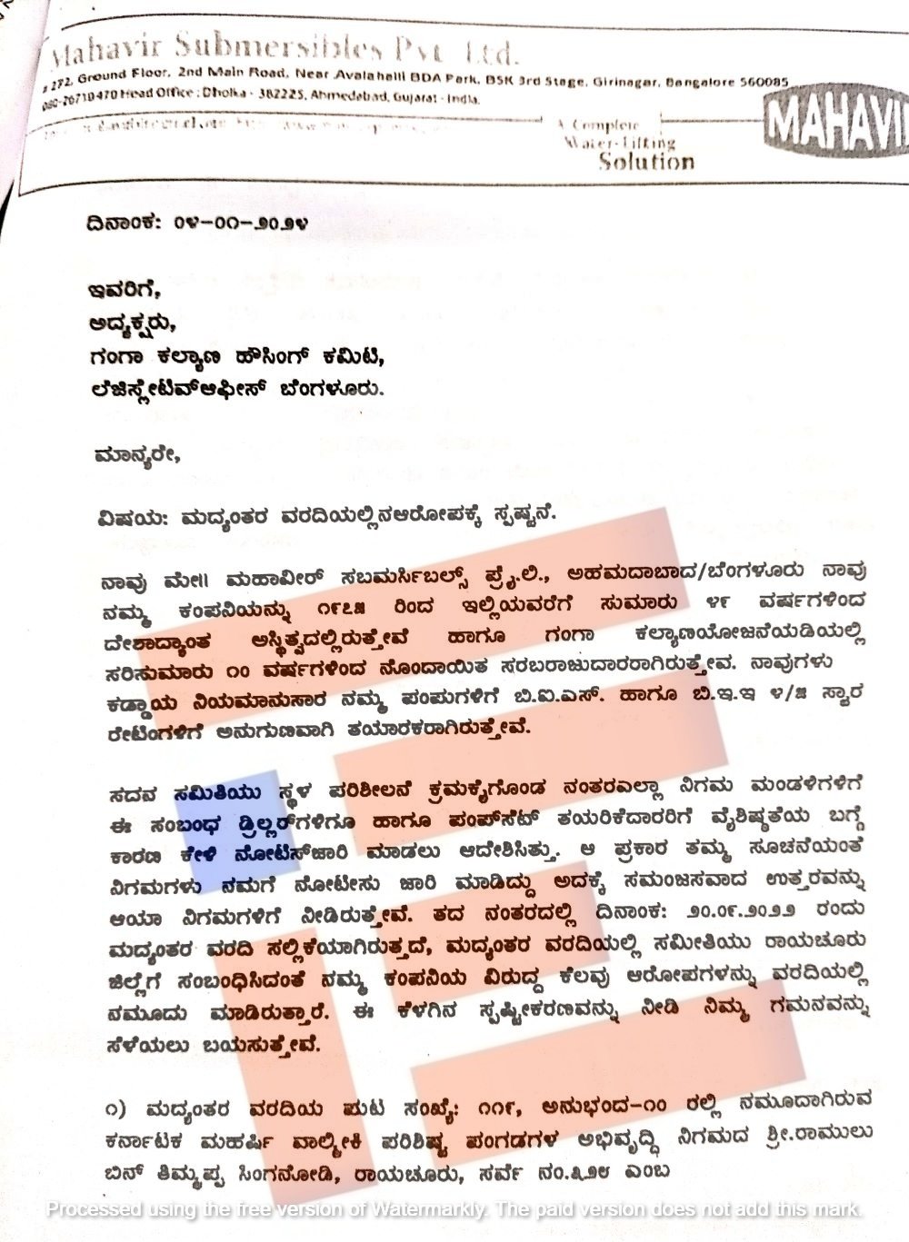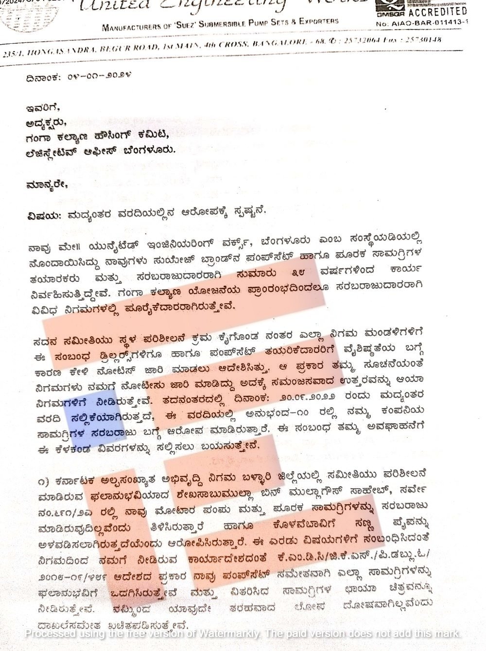 ‘ನಿಗಮವು ನೀಡಿರುವ ಕಾರ್ಯಾದೇಶದಂತೆಯೇ ನಾವು ಪಂಪ್ಸೆಟ್ ಸಮೇತವಾಗಿ ಎಲ್ಲಾ ಸಾಮಗ್ರಿಗಳನ್ನೂ ಫಲಾನುಭವಿಗಳಿಗೆ ಒದಗಿಸಿದ್ದೇವೆ. ನಮ್ಮಿಂದ ಯಾವುದೇ ತರಹದ ಲೋಪ ದೋಷವಾಗಿಲ್ಲ. ಕಾರ್ಯಾದೇಶಕ್ಕೆ ಅನುಗುಣವಾಗಿ ಗುಣಮಟ್ಟದ ಸಾಮಗ್ರಿಗಳನ್ನು ಪೂರೈಸಿದ್ದೇವೆ.