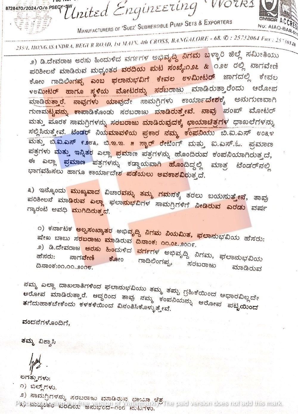 ಇವೇ ಕಂಪನಿಗಳು ಕರ್ನಾಟಕ ಅಲ್ಪಸಂಖ್ಯಾತರ ಅಭಿವೃದ್ದಿ ನಿಗಮವು ಅನುಷ್ಠಾನಗೊಳಿಸಿದ್ದ ಗಂಗಾ ಕಲ್ಯಾಣ ಯೋಜನೆಯಡಿಯಲ್ಲಿ ಕೊರೆಸಿದ್ದ ಕೊಳವೆ ಬಾವಿಗಳಿಗೆ ಪೂರಕ ಸಾಮಗ್ರಿಗಳನ್ನು ಒದಗಿಸಿದ್ದವು. ಈ ಕಂಪನಿಗಳು ಬಳ್ಳಾರಿ ಜಿಲ್ಲೆಯಲ್ಲಿ ಪೂರೈಸಿದ್ದ ಸಾಮಗ್ರಿಗಳು ಗುಣಮಟ್ಟದಿಂದ ಕೂಡಿರಲಿಲ್ಲ. ಕೆಲವು ಕೊಳವೆ ಬಾವಿಗಳಲ್ಲಿ ಕಡಿಮೆ ನೀರು ಬಿದ್ದಿದೆ. ಮೋಟಾರ್ ಪಂಪ್ ಸರಬರಾಜು ಮಾಡಿಲ್ಲ. ಕೊಳವೆ ಬಾವಿಗಳಿಗೆ ಸಣ್ಣ ಪೈಪ್ಗಳನ್ನು ಅಳವಡಿಸಿದೆ ಎಂದು ಫಲಾನುಭವಿಗಳು ಯುನೈಟೆಡ್ ಇಂಜಿನಿಯರಿಂಗ್ ವರ್ಕ್ಸ್ ವಿರುದ್ಧ ದೂರು ಸಲ್ಲಿಸಿದ್ದವು.