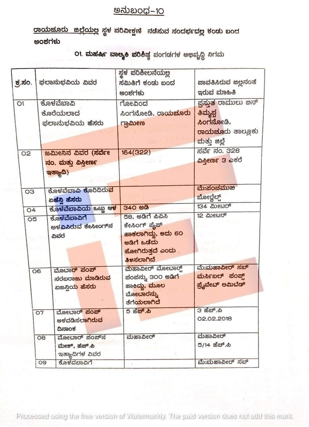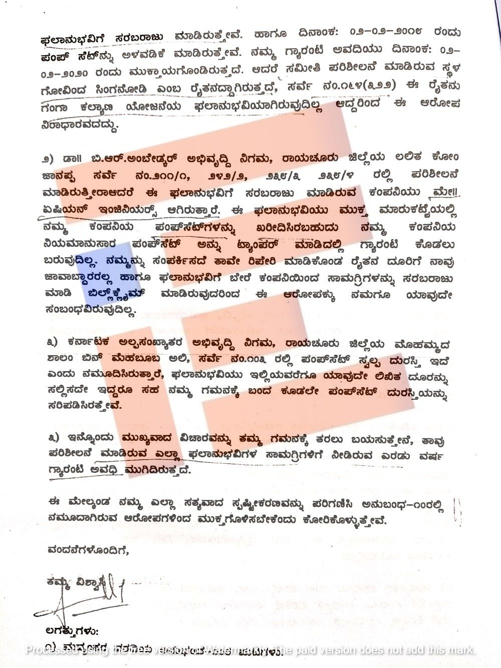 ‘ಸಮಿತಿ ಪರಿಶೀಲನೆ ಮಾಡಿರುವ ಪೈಕಿ ಗೋವಿಂದ ಸಿಂಗನೋಡಿ ಎಂಬ ರೈತನು ಗಂಗಾ ಕಲ್ಯಾಣ ಯೋಜನೆಯ ಫಲಾನುಭವಿಯಾಗಿಲ್ಲ. ಈ ಫಲಾನುಭವಿಗೆ ಏಷಿಯನ್ ಇಂಜಿನಿಯರ್ಸ್ ಸಾಮಗ್ರಿ ಸರಬರಾಜು ಮಾಡಿದೆ. ಫಲಾನುಭವಿಯು ಮುಕ್ತ ಮಾರುಕಟ್ಟೆಯಲ್ಲಿ ನಮ್ಮ ಕಂಪನಿಯ ಪಂಪ್ ಸೆಟ್ ಖರೀದಿಸಿರಬಹುದು. ನಮ್ಮ ಕಂಪನಿಯ ನಿಯಮಾನುಸಾರ ಪಂಪ್ ಸೆಟ್ನ್ನು ಟ್ಯಾಂಪರ್ ಮಾಡಿದಲ್ಲಿ ಗ್ಯಾರಂಟಿ ಕೊಡಲು ಬರುವುದಿಲ್ಲ.
