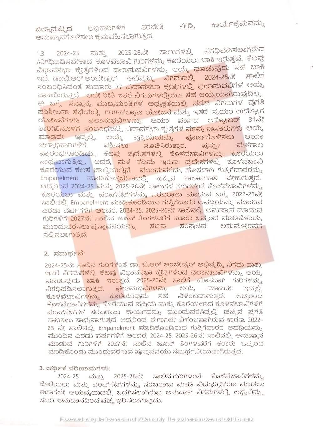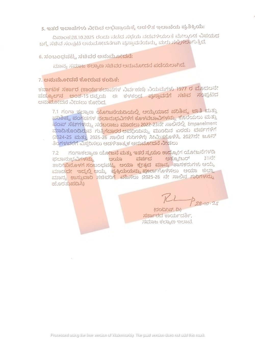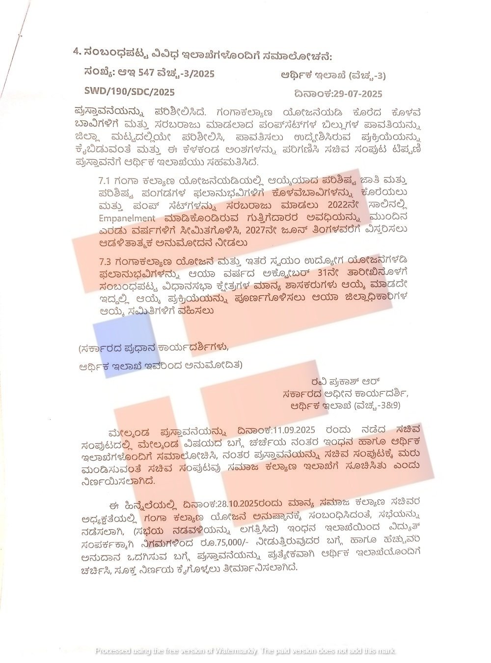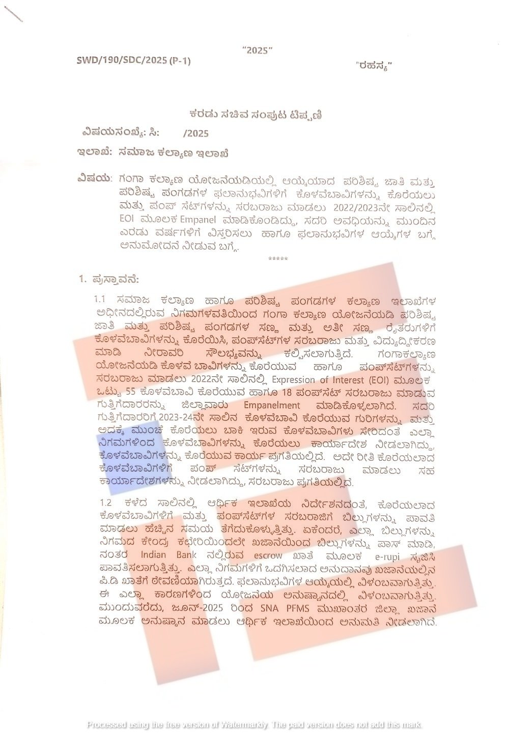 ಗಂಗಾ ಕಲ್ಯಾಣ ಯೋಜನೆಯ ಗುತ್ತಿಗೆದಾರರ ಅವಧಿಯನ್ನು ಮುಂದಿನ 2 ವರ್ಷಗಳಿಗೆ ಅಂದರೇ 2027ನೇ ಜೂನ್ ವರೆಗೆ ವಿಸ್ತರಿಸುವ ಸಂಬಂಧ ಸಮಾಜ ಕಲ್ಯಾಣ ಇಲಾಖೆಯು ಸಚಿವ ಸಂಪುಟಕ್ಕೆ ಕಡತ ಮಂಡಿಸಿತ್ತು. ಕಡತದ ಟಿಪ್ಪಣಿ ಹಾಳೆಗಳು ‘ದಿ ಫೈಲ್’ಗೆ ಲಭ್ಯವಾಗಿವೆ.