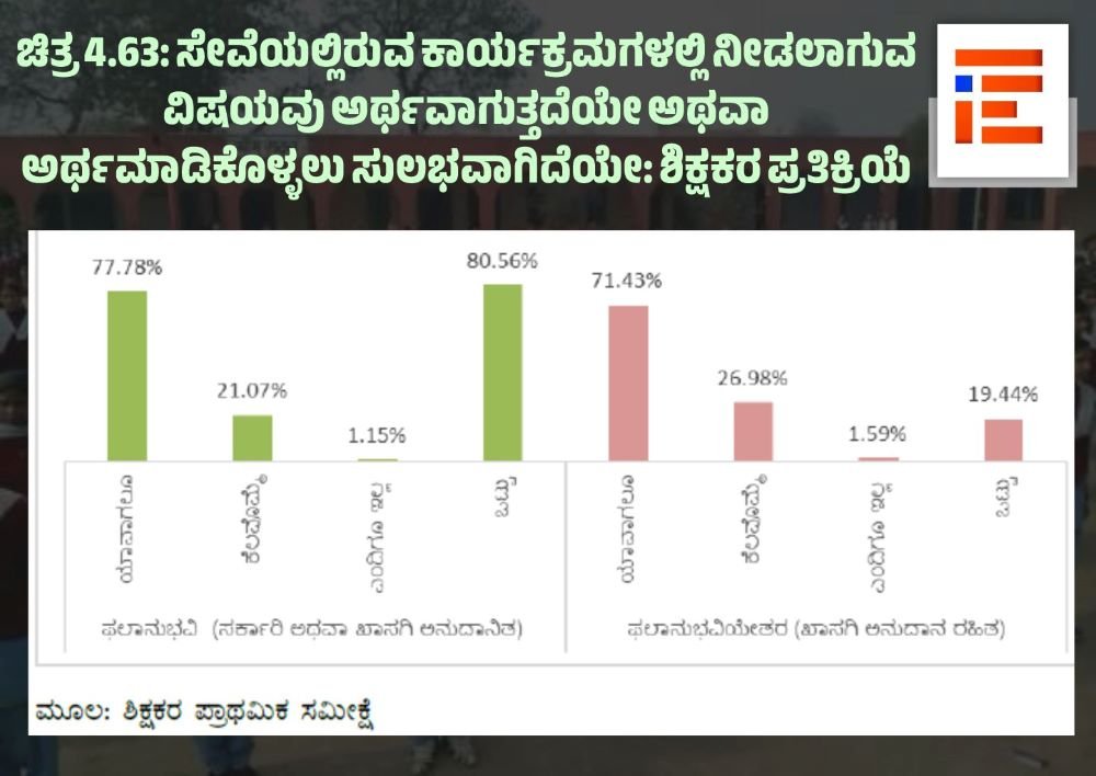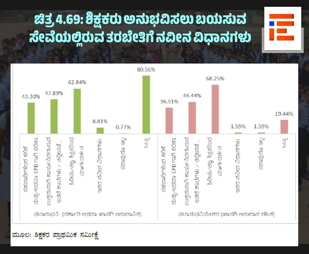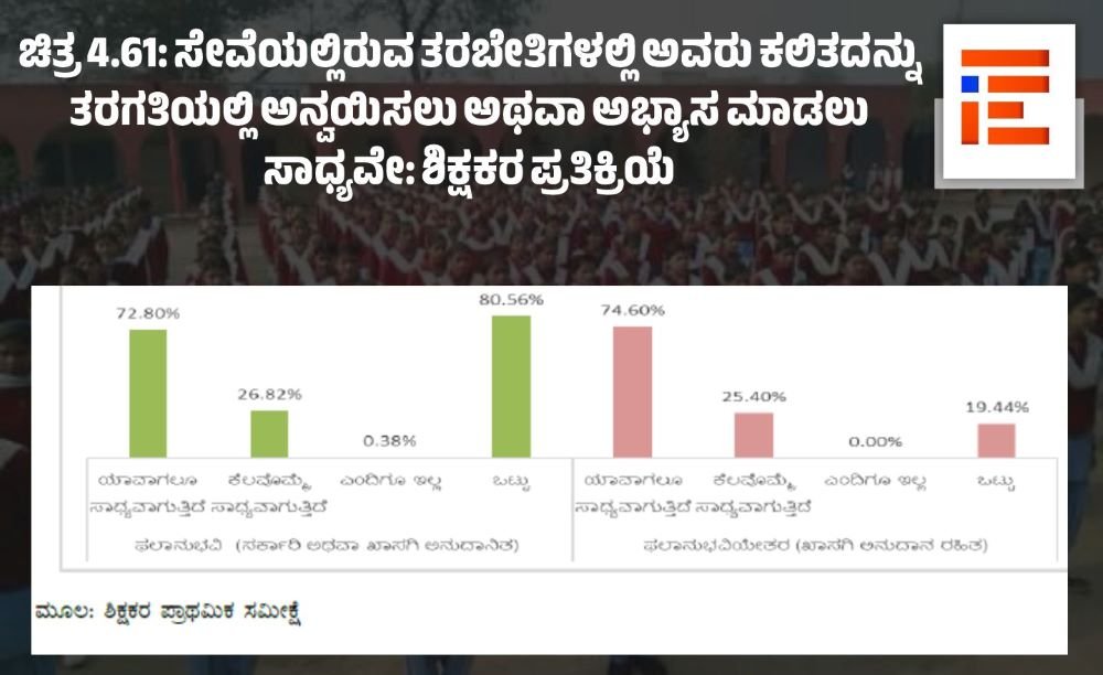 ತರಬೇತಿಗಳಲ್ಲಿ ಕಲಿತದ್ದನ್ನು ತರಗತಿಯಲ್ಲಿ ಅನ್ವಯಿಸಲು ಅಥವಾ ಅಭ್ಯಾಸ ಮಾಡಲು ಸಾಧ್ಯವೇ ಎನ್ನುವ ಸಮೀಕ್ಷಕರ ಪ್ರಶ್ನೆಗೆ ಶೇ.72.80 ರಷ್ಟು ಸರ್ಕಾರಿ ಶಾಲೆಗಳ ಶಿಕ್ಷಕರು ಹೇಳಿದ್ದರೇ ಅನುದಾನಿತ ಶಾಲೆ ಶಿಕ್ಷಕರು “ಯಾವಾಗಲೂ ಸಾಧ್ಯವಾಗುತ್ತಿದೆʼʼ ಎಂದು ಪ್ರತಿಕ್ರಿಯಿಸಿದ್ದಾರೆ. ಖಾಸಗಿ ಶಾಲೆ ಶಿಕ್ಷಕರ ಪ್ರತಿಕ್ರಿಯೆ ಪ್ರಮಾಣ ಶೇ.74.60 ರಷ್ಟಿದೆ. ಶೇ. 26.82 ರಷ್ಟು ಸರ್ಕಾರಿ, ಅನುದಾನಿತ ಶಾಲೆ ಶಿಕ್ಷಕರು ಮತ್ತು ಶೇ.25.40 ಖಾಸಗಿ ಶಾಲೆ ಶಿಕ್ಷಕರ ಅಭಿಪ್ರಾಯ “ಕೆಲವೊಮ್ಮೆ ಸಾಧ್ಯವಾಗುತ್ತಿದೆ,ʼ ಎಂದು ಪ್ರತಿಕ್ರಿಯಿಸಿರುವುದು ವರದಿಯಿಂದ ಗೊತ್ತಾಗಿದೆ.