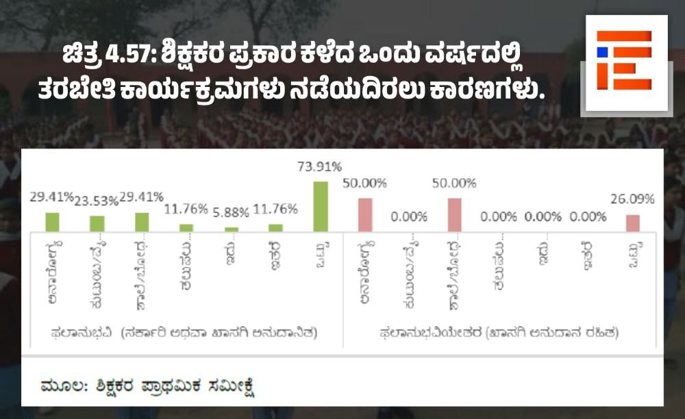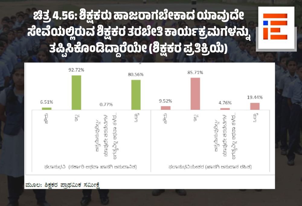 ಹಾಗೆಯೇ ಶಿಕ್ಷಕರು ಹಾಜರಾಗಲೇಬೇಕಿದ್ದ ತರಬೇತಿಗಳಿಗೆ ನಿಯಮಿತವಾಗಿ ಹಾಜರಾಗಿಲ್ಲ. ಬದಲಿಗೆ ತಪ್ಪಿಸಿಕೊಂಡಿದ್ದಾರೆ. ಇದಕ್ಕೆ ಶಿಕ್ಷಕರು ನೀಡಿದ್ದ ಕಾರಣಗಳನ್ನೂ ಮೌಲ್ಯಮಾಪನ ವರದಿಯಲ್ಲಿ ಉಲ್ಲೇಖಿಸಿದೆ.