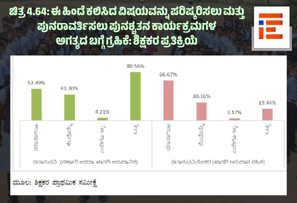 ಈ ಹಿಂದೆ ತರಬೇತಿಗಳಲ್ಲಿ ಕಲಿಸಿದ ವಿಷಯವನ್ನು ಪರಿಷ್ಕರಿಸಲು ಮತ್ತು ಪುನರಾವರ್ತಿಸಲು ಪುನಶ್ಚೇತನ ಕಾರ್ಯಕ್ರಮಗಳ ಅಗತ್ಯದ ಬಗ್ಗೆ ಶಿಕ್ಷಕರ ಗ್ರಹಿಕೆಯನ್ನು ಅರಿಯಲು ನಡೆಸಿದ ಸಮೀಕ್ಷೆಯಲ್ಲಿ ಶೇ 52.49 ಸರ್ಕಾರಿ, ಅನುದಾನಿತ ಶಾಲೆ ಶಿಕ್ಷಕರು, ಶೇ.66.67 ಖಾಸಗಿ ಶಾಲೆ ಶಿಕ್ಷಕರು “ಯಾವಾಗಲೂ ಅಗತ್ಯʼʼ ಎನ್ನುವ ಅಭಿಪ್ರಾಯ ದಾಖಲಿಸಿದ್ದಾರೆ. ಶೇ.43.30 ಸರ್ಕಾರಿ, ಅನುದಾನಿತ ಮತ್ತು ಶೇ.30.16, ಖಾಸಗಿ ಶಾಲೆ ಶಿಕ್ಷಕರು “ಕೆಲವೊಮ್ಮೆ ಅಗತ್ಯʼʼ ಎಂದಿದ್ದಾರೆ. ಕ್ರಮವಾಗಿ ಶೇ.4.12 ಮತ್ತು ಶೇ.3.17 ಶಿಕ್ಷಕರು “ಎಂದಿಗೂ ಅಗತ್ಯವಿಲ್ಲʼʼ ಎಂದಿದ್ದಾರೆ.