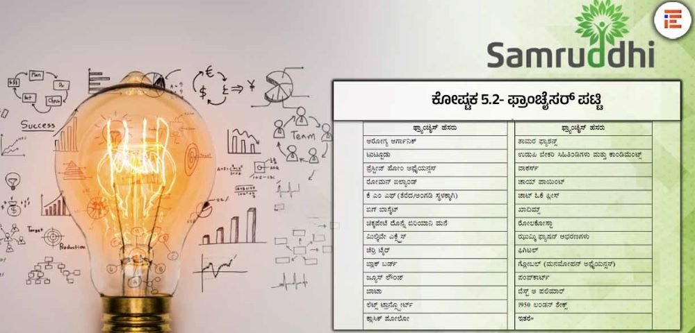 ಆರೋಗ್ಯ ಆರ್ಗಾನಿಕ್, ಟುಟ್ಟೂಡು, ಪ್ರೆಸ್ಟೀಜ್ ಹೋಂ ಅಪ್ಲೈಯನ್ಸಸ್, ರೋಮನ್ ಐಲ್ಯಾಂಡ್, ಕೆಎಂಎಫ್, ಬಿಗ್ ಬಾಸ್ಕೆಟ್, ಚಿಕ್ಕಪೇಟೆ ದೊನ್ನೆ ಬಿರಿಯಾನಿ ಮನೆ, ಮಿಲ್ಕಿವೇ ಎಕ್ಸೈಸ್, ಚೆರ್ರಿ ಟೈರ್, ಬ್ಲಾಕ್ ಬರ್ಡ್, ಜ್ಯೂಸ್ ಲಾಂಜ್, ಬಾಟಾ, ಕ್ಲಾಸಿಕ್ ಪೋಲೋ, ಲಂಡನ್ ಶೇಕ್ಸ್, ಖಾಧಿಮ್ಸ್, ಚಾಟ್ ಒಕೆ ಪ್ಲೀಸ್, ಚಾಯ್ ಪಾಯಿಂಟ್, ಉಡುಪಿ ಬೇಕರಿ ಸಿಹಿ ತಿಂಡಿಗಳು, ಕಾಂಡಿಮೆಂಟ್ಸ್, ವಾಕರ್ಸ್ ಸೇರಿದಂತೆ ಇನ್ನಿತರೆ ಪ್ರಾಂಚೈಸ್ಗಳನ್ನು ಫಲಾನುಭವಿಗಳು ಆರಂಭಿಸಿದ್ದರು. ಈ ಪೈಕಿ ಆರೋಗ್ಯ ಆರ್ಗಾನ್ಯಿಕ್ ಪ್ರಮುಖ ಪಾಲನ್ನು ಹೊಂದಿದೆ.