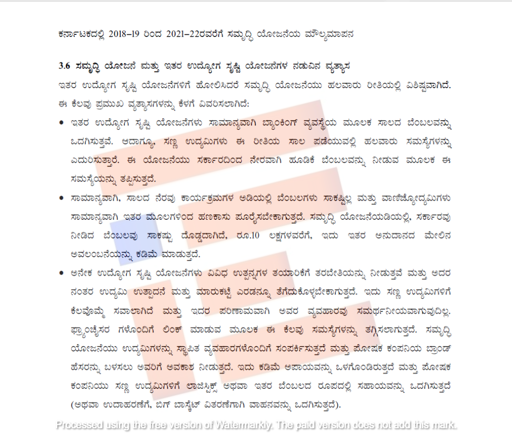 2018-19ರಲ್ಲಿದ್ದ ಕಾಂಗ್ರೆಸ್ ಮತ್ತು ಜೆಡಿಎಸ್ ಪಾಲುದಾರಿಕೆಯ ಸಮ್ಮಿಶ್ರ ಸರ್ಕಾರವು ಸಮೃದ್ಧಿ ಯೋಜನೆಯನ್ನು ಪರಿಚಯಿಸಿತ್ತು. ಈ ಯೋಜನೆ ಅನುಷ್ಠಾನಕ್ಕೆ ಸಂಬಂಧಿಸಿದಂತೆ ಕರ್ನಾಟಕ ಮೌಲ್ಯಮಾಪನ ಪ್ರಾಧಿಕಾರವು ಮೌಲ್ಯಮಾಪನ ಮಾಡಿತ್ತು. ಪ್ರಾಧಿಕಾರದ ಪರವಾಗಿ ಐಸೆಕ್ನ ಡಾ ಮೀನಾಕ್ಷಿ ಭಟ್ ಅವರು ಮಾಡಿರುವ ಮೌಲ್ಯಮಾಪನ ವರದಿಯ ಪ್ರಕಾರ ಸಮೃದ್ಧಿ ಯೋಜನೆಯು, ದಲಿತ ಸಮುದಾಯದ ನಿರುದ್ಯೋಗಿಗಳನ್ನು ನಿರೀಕ್ಷಿತ ಪ್ರಮಾಣದಲ್ಲಿ ಸ್ವಾವಲಂಬಿಗಳನ್ನಾಗಿಸುವಲ್ಲಿ ವಿಫಲವಾಗಿರುವುದು ಮೇಲ್ನೋಟಕ್ಕೆ ಕಂಡು ಬಂದಿದೆ.