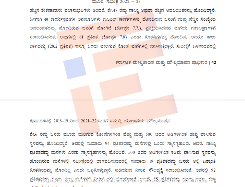 ಸಮೀಕ್ಷೆಗೆ ಒಳಗಾದವರಲ್ಲಿ ಶೇ. 6ರಷ್ಟು ಜನರು ಮೂರು ಮಲಗುವ ಕೋಣೆಗಳಿಗಿಂತ ಹೆಚ್ಚು ಮತ್ತು 500 ಚದರ ಅಡಿಗಳಿಗಿಂತ ಹೆಚ್ಚು ವಾಸಿಸುವ ಸ್ಥಳವನ್ನು ಹೊಂದಿದ್ದಾರೆ. ಅವರಲ್ಲಿ ಸುಮಾರು 94 ಪ್ರತಿಶತದಷ್ಟು ಮನೆಗಳಲ್ಲಿ ಒಂದು ಸ್ನಾನಗೃಹವಿದೆ ಎಂದು ಫಲಾನುಭವಿಗಳ ಸಾಮಾಜಿಕ, ಆರ್ಥಿಕ ಸ್ಥಿತಿಗತಿ ಮೇಲೂ ಬೆಳಕು ಚೆಲ್ಲಿದೆ.