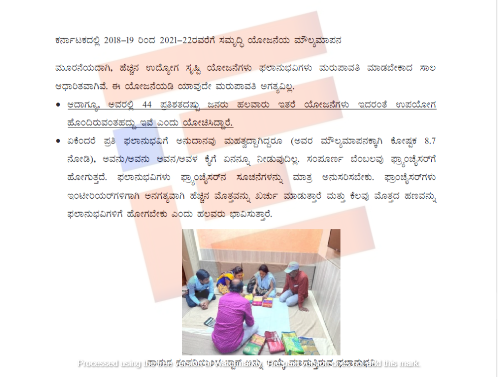 ಆದರೆ ಪ್ರಾಂಚೈಸರ್ ಕಂಪನಿಗಳು ನೀಡುತ್ತಿರುವ ವಸ್ತುಗಳು ದುಬಾರಿಯಾಗಿವೆ. ಮಾರಾಟ ಮಾಡಲು ಸಾಧ್ಯವಾಗುತ್ತಿಲ್ಲ ಎಂದು ಫಲಾನುಭವಿಗಳು ಮೌಲ್ಯಮಾಪನ ತಂಡಕ್ಕೆ ದೂರಿದ್ದಾರೆ. ಈ ಸಮೃದ್ಧಿ ಯೋಜನೆ ನಡೆಸುತ್ತಿರುವ ಪ್ರೈಸ್ ವಾಟರ್ ಹೌಸ್ ಕೂಪರ್ಸ್, ಉತ್ತಮ ಕೆಲಸ ಮಾಡಿಲ್ಲ ಮತ್ತು ಅವರಿಂದ ಯಾರಿಗೂ ಬೆಂಬಲ ಸಿಕ್ಕಿಲ್ಲ ಎಂದು ಫಲಾನುಭವಿಗಳು ಮೌಲ್ಯಮಾಪನ ತಂಡದ ಮುಂದೆ ಅಲವತ್ತುಕೊಂಡಿರುವುದು ತಿಳಿದು ಬಂದಿದೆ.