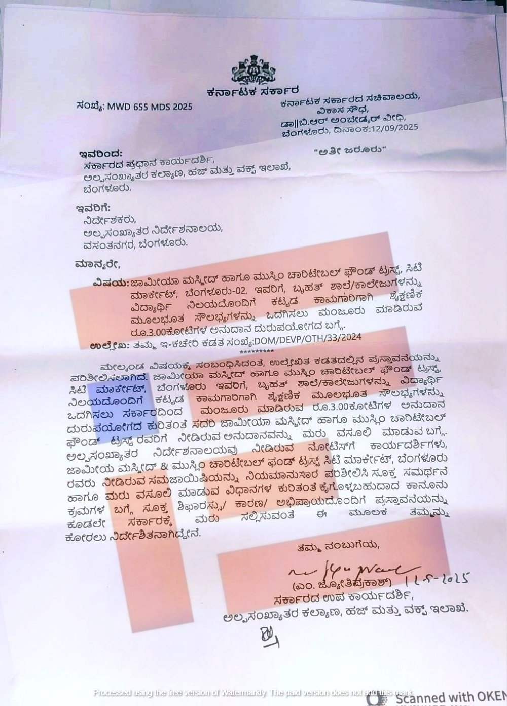 ಜಾಮೀಯಾ ಮಸ್ಜಿದ್ ಹಾಗೂ ಮುಸ್ಲಿಂ ಚಾರಿಟೇಬಲ್ ಫೌಂಡ್ ಟ್ರಸ್ಟ್ಗೆ ಬೃಹತ್ ಶಾಲೆ, ಕಾಲೇಜು, ವಿದ್ಯಾರ್ಥಿ ನಿಲಯಗಳ ಕಟ್ಟಡ ಕಾಮಗಾರಿ ಮತ್ತು ಶೈಕ್ಷಣಿಕ ಮೂಲಭೂತ ಸೌಲಭ್ಯಗಳನ್ನು ಒದಗಿಸಲು ಸರ್ಕಾರವು 3 ಕೋಟಿ ರು ಅನುದಾನ ಮಂಜೂರುಮಾಡಿತ್ತು. ಆದರೆ ಈ ಅನುದಾನವನ್ನು ಟ್ರಸ್ಟ್ ದುರುಪಯೋಗಪಡಿಸಿಕೊಂಡಿದೆ. ಈ ಹಣವನ್ನು ಮರು ವಸೂಲಿ ಮಾಡಬೇಕು. ದುರುಪಯೋಗವಾಗಿರುವ ಹಣವನ್ನು ಮರು ವಸೂಲಿ ಮಾಡುವ ಸಂಬಂಧ ನಿರ್ದೇಶನಾಲಯವು ಕೈಗೊಳ್ಳಬೇಕಾದ ಕ್ರಮಗಳ ಕುರಿತು ಸೂಕ್ತ ಶಿಫಾರಸ್ಸು, ಕಾರಣ ಮತ್ತು ಅಭಿಪ್ರಾಯವನ್ನು ಸಲ್ಲಿಸಬೇಕು ಎಂದು ಇಲಾಖೆಯ ಸರ್ಕಾರದ ಪ್ರಧಾನ ಕಾರ್ಯದರ್ಶಿಯು ಪತ್ರದಲ್ಲಿ ನಿರ್ದೇಶನ ನೀಡಿರುವುದು ಗೊತ್ತಾಗಿದೆ.